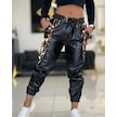 Bel Ve Paça Lastikli Detay Yanları Leopar Bağcıklı Deri Pantolon Siyah