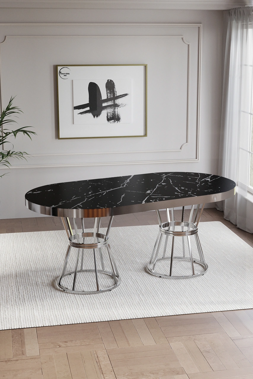 Dengema Duman Açılır Masa Takımı Gri Mermer - Krom Metal Ayak 80 130 160 Cm, 4 Sandalyeli Gri Mermer - Krom Ayak