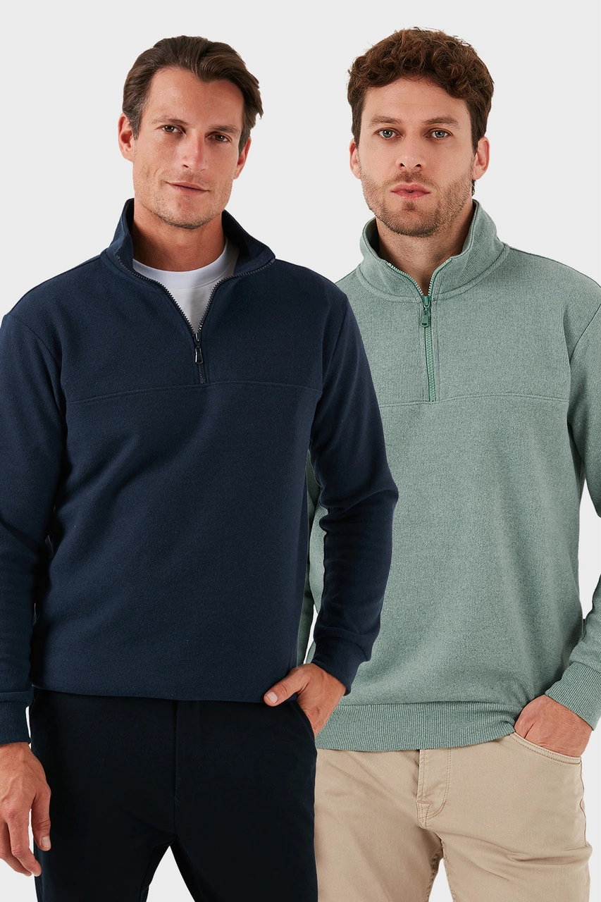 Buratti Pamuklu Regular Fit Yarım Fermuarlı Dik Yaka 2'Li Paket Erkek Kazak 456112S2 Çağla-Lacivert