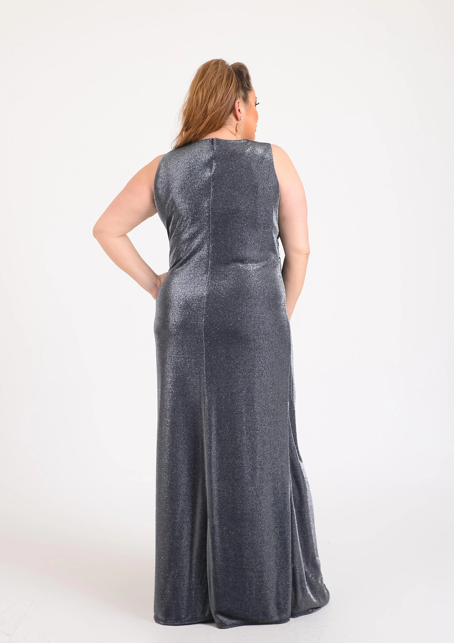 Büyük Beden Füme Renkli Kolsuz Kruvaze Yaka Likralı Simli Abiye Elbise Füme