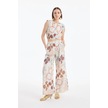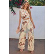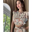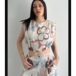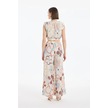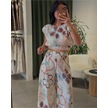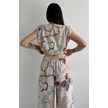 Büyük Pastel Çiçekli Vatkalı 80ler Lastikli Pantolon Crop Keten Yazlık İkili Takım Krem