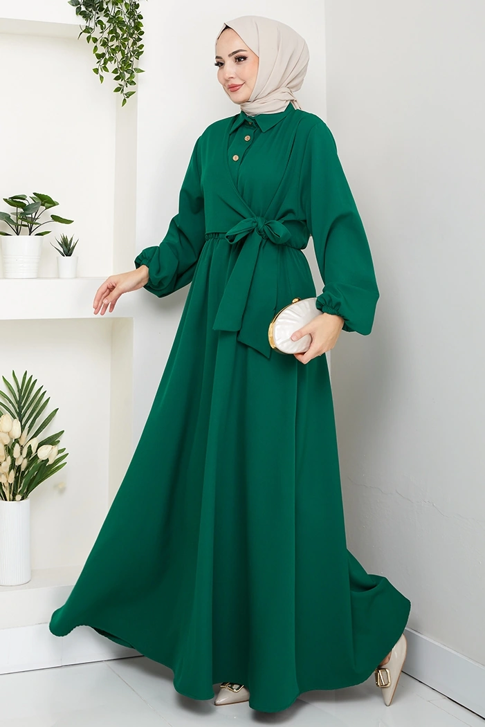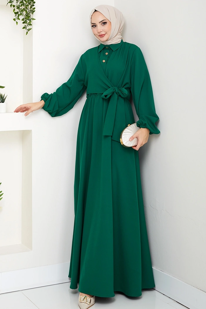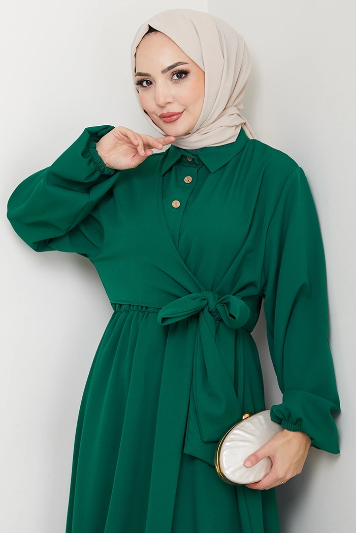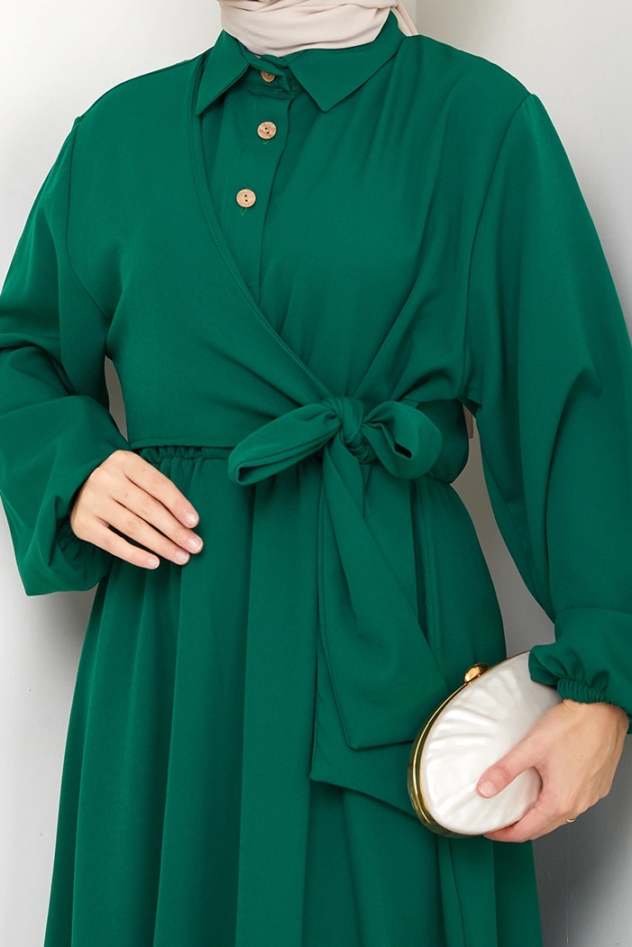 Çapraz Bağlamalı Gömlek Yaka Elbise 1636 - Zümrüt Yeşili Zümrüt Yeşili