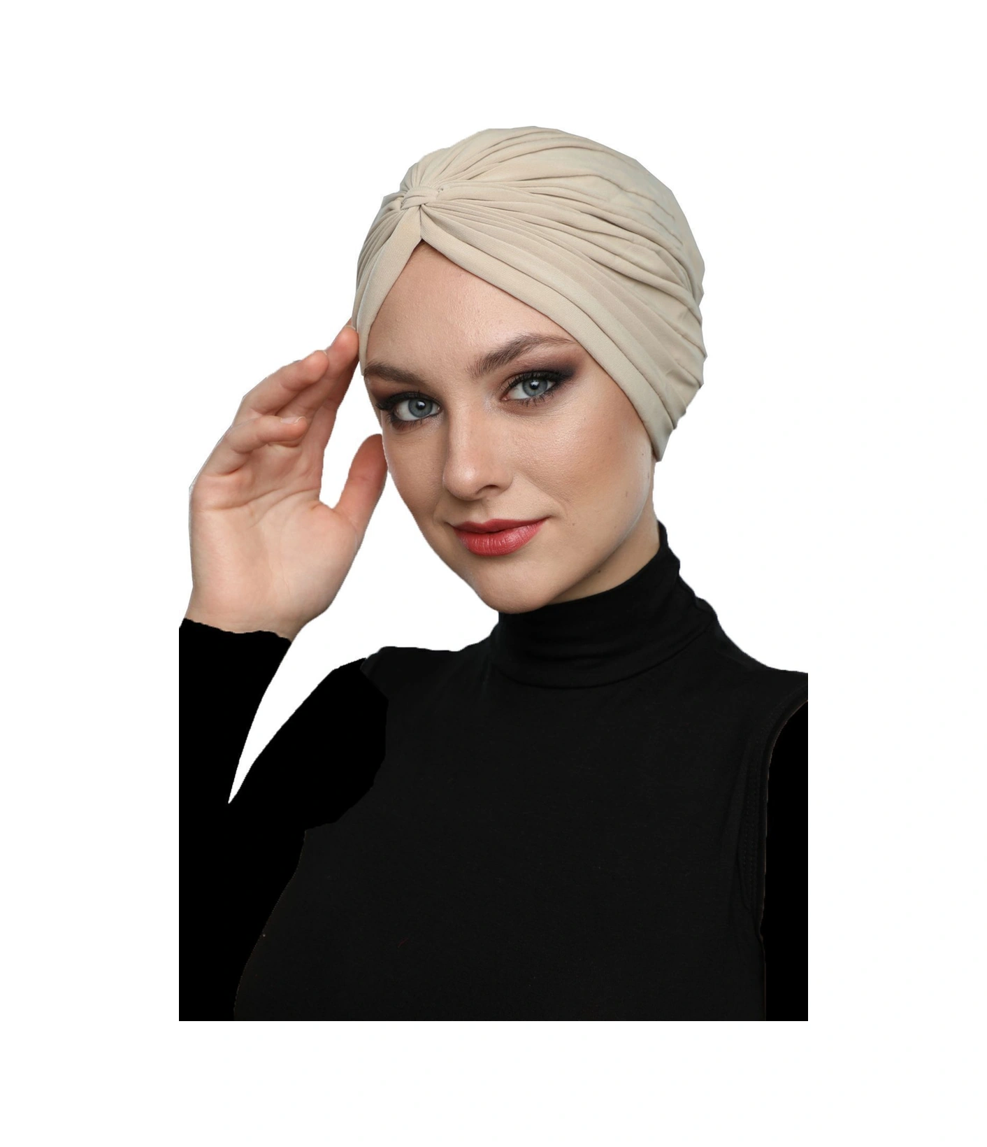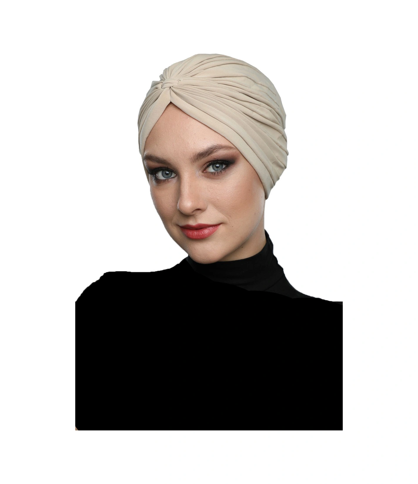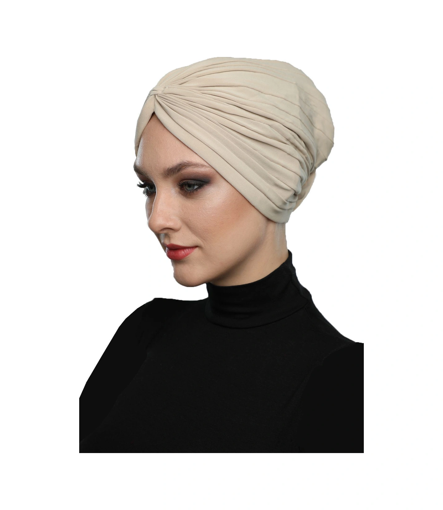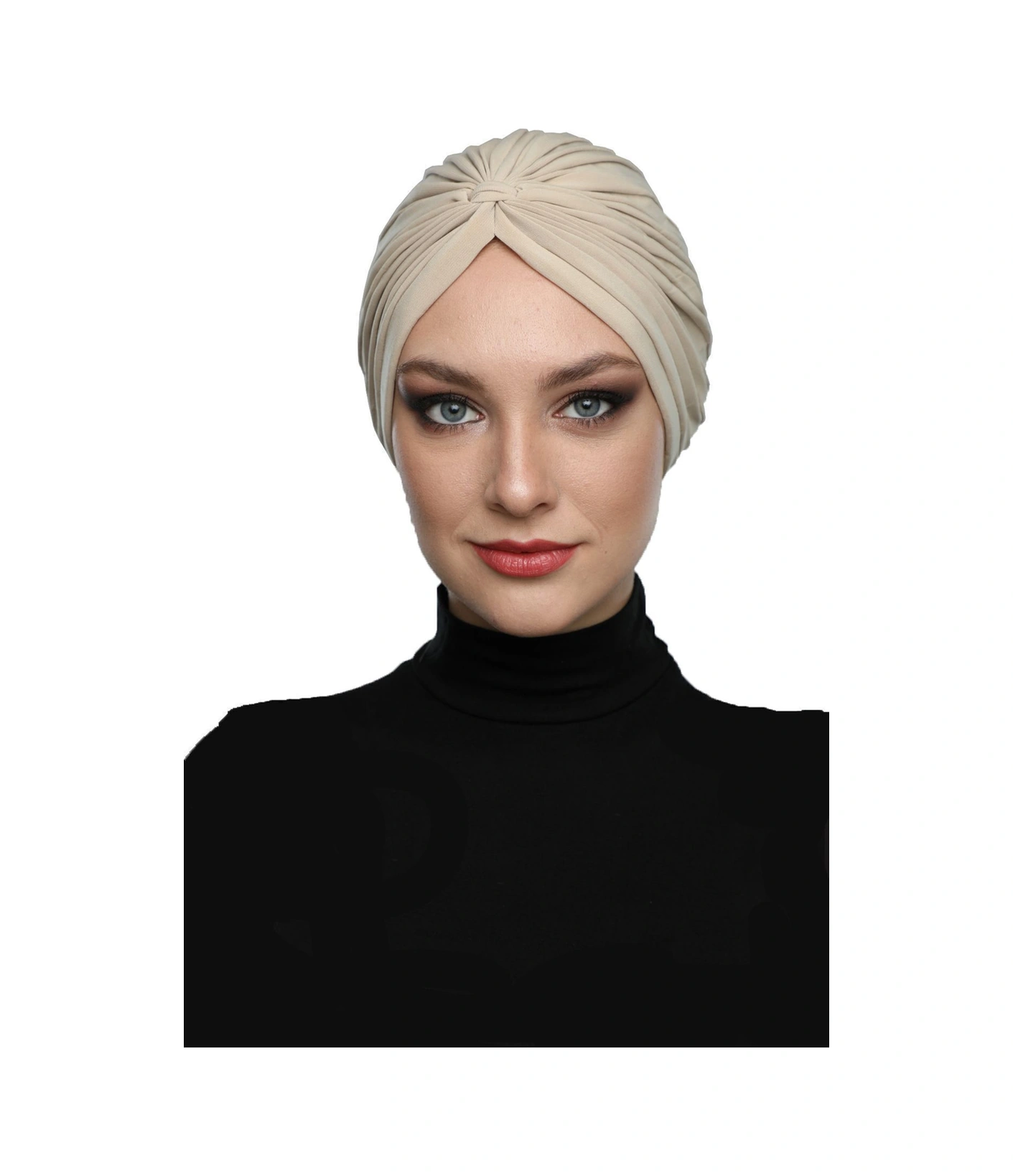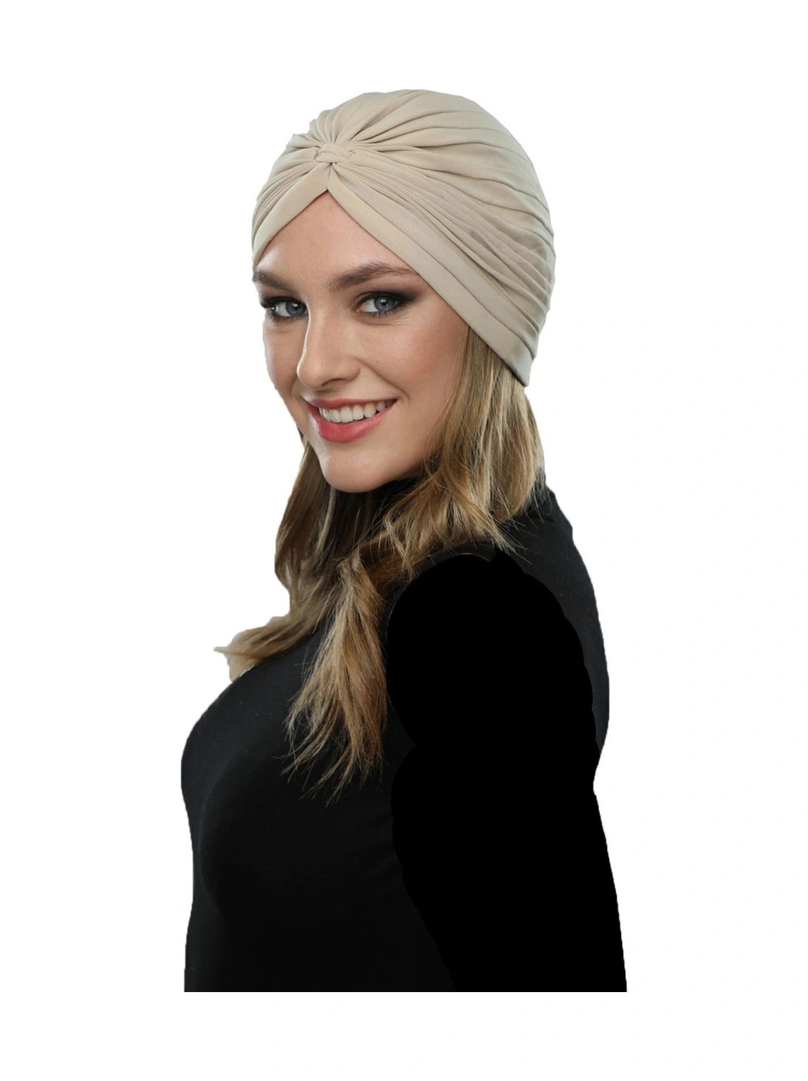 Çapraz Bantlı Kum Beji Hazır Türban Tesettür Havuz Bonesi Bej