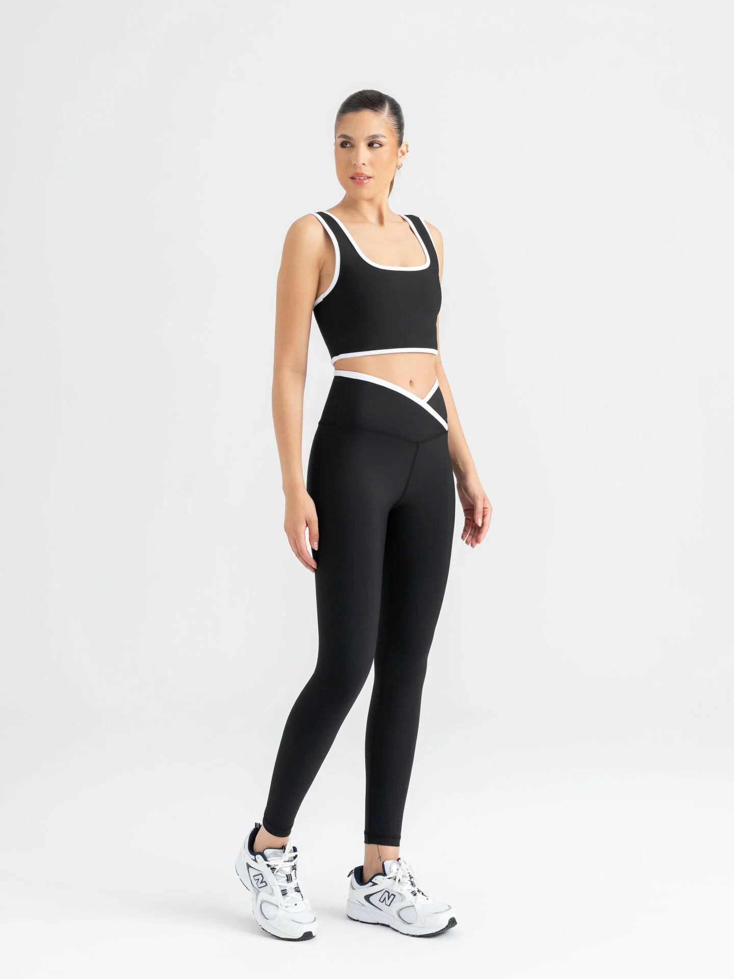 Çapraz Beli Beyaz Biye Detaylı Spor Tayt Siyah