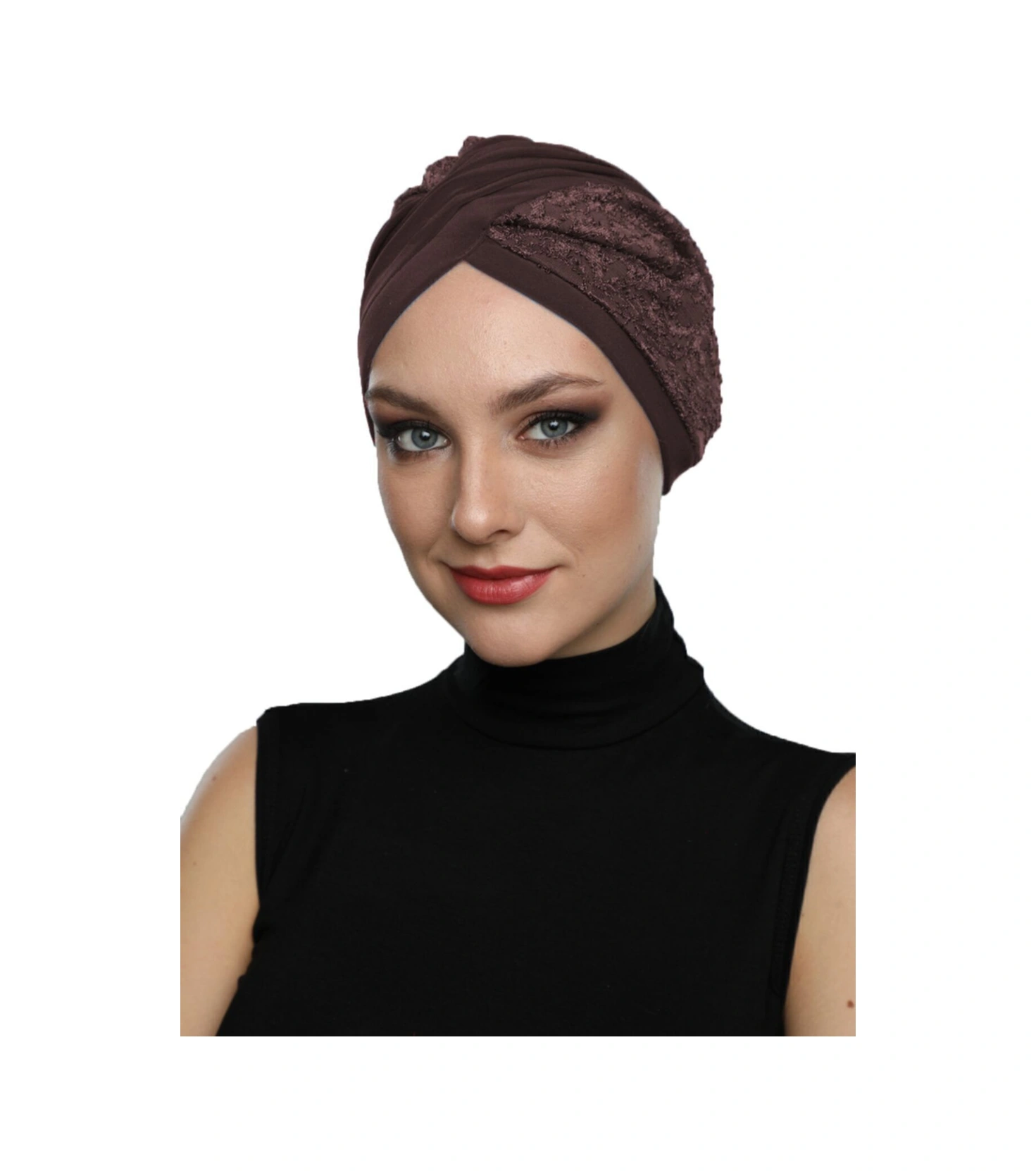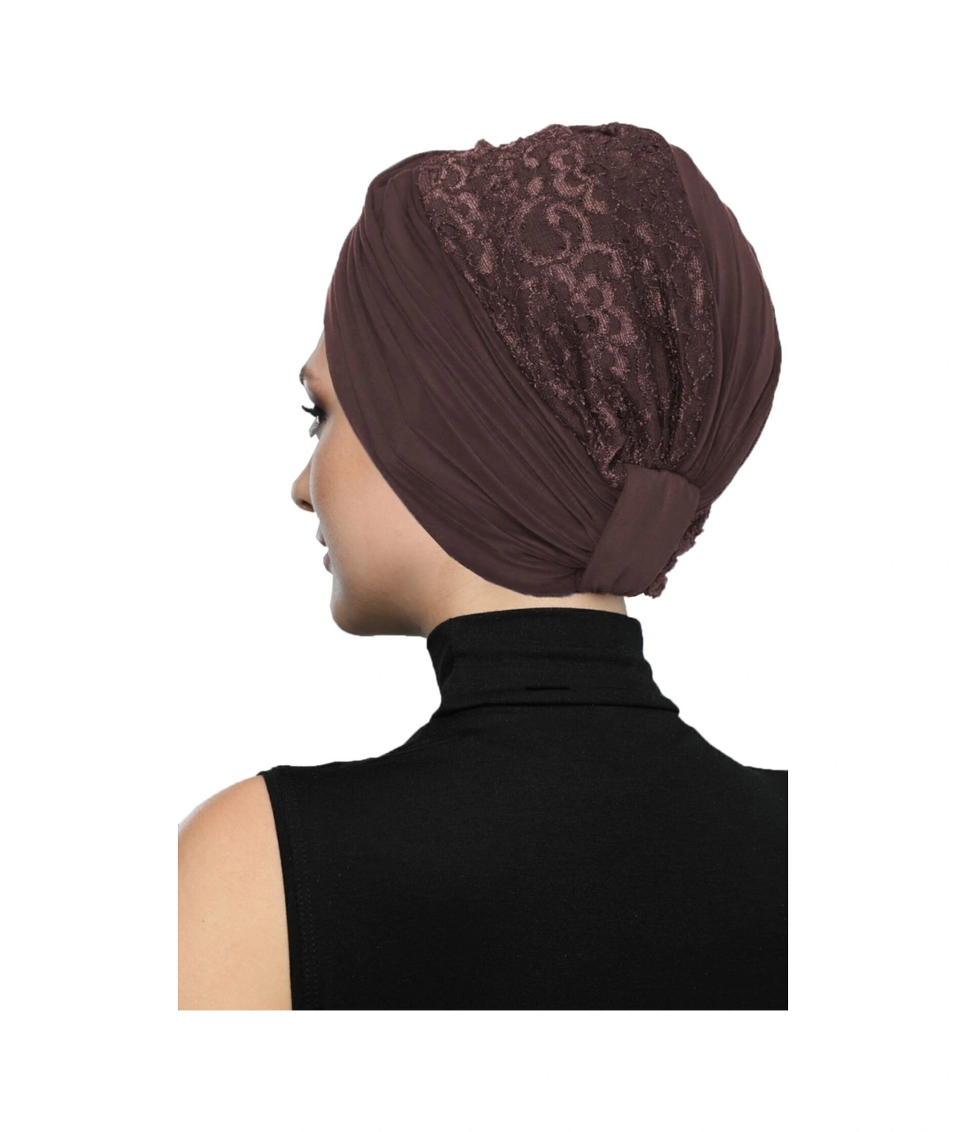 Çapraz Dantel Kahve Hazır Türban Tesettür Havuz Bonesi Kahve