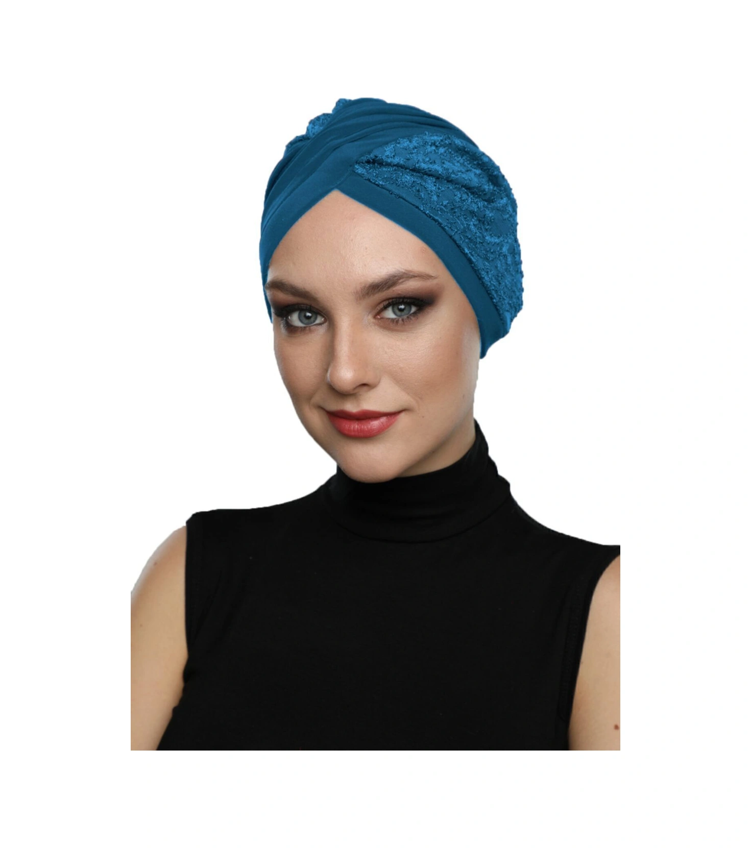 Çapraz Dantel Petrol Hazır Türban Tesettür Havuz Bonesi Petrol