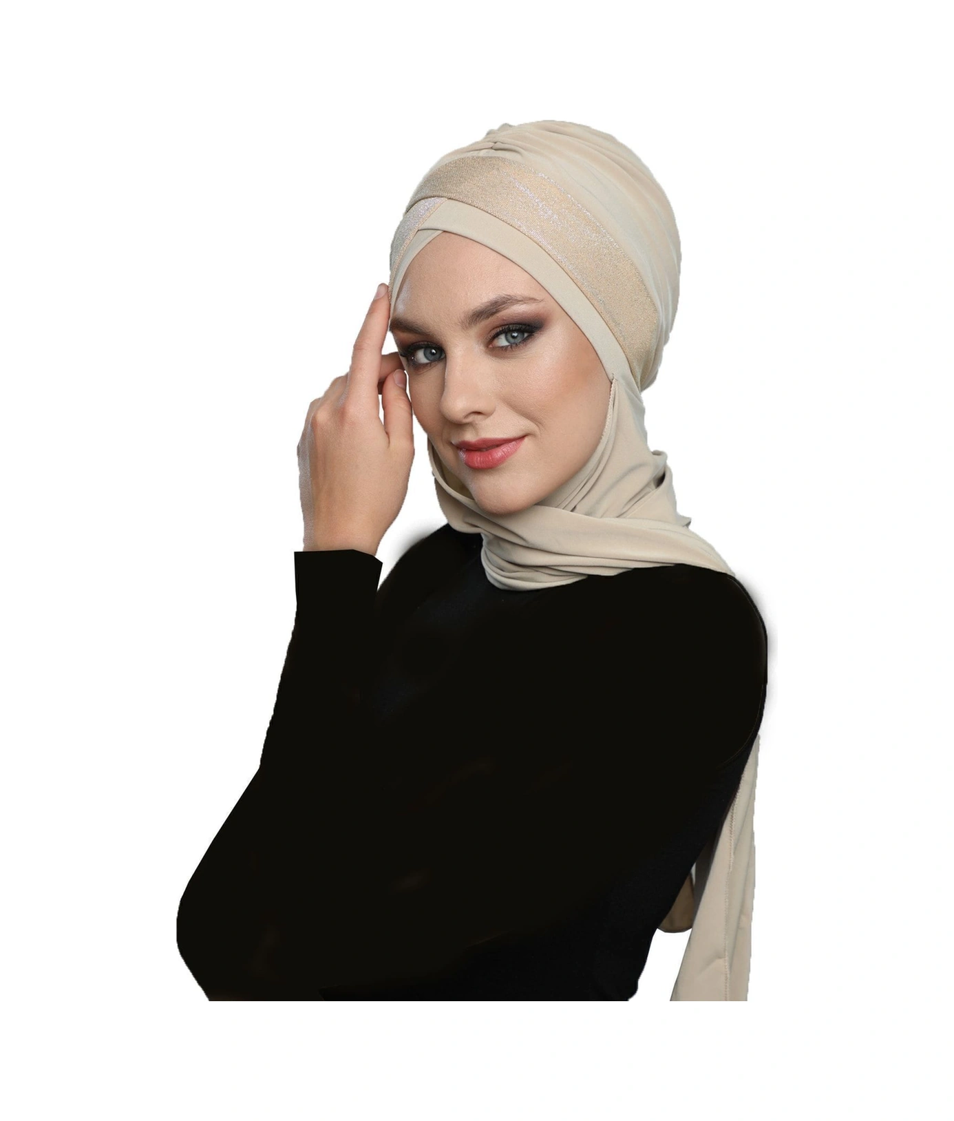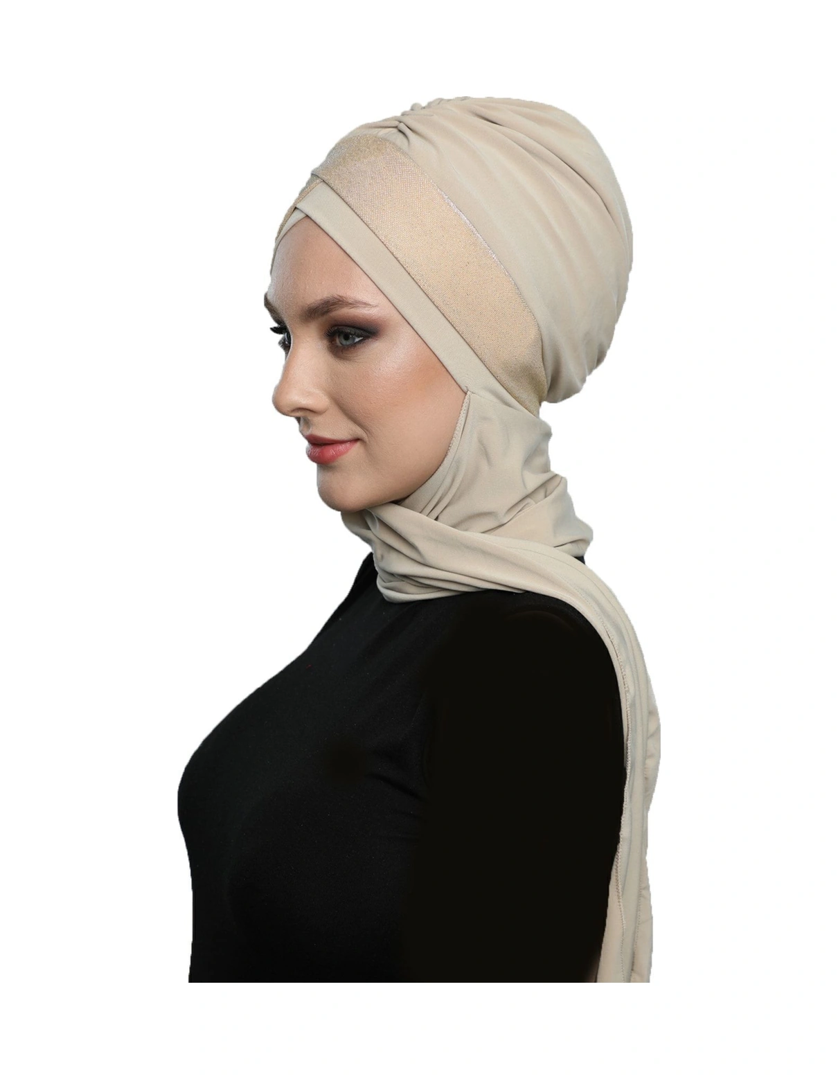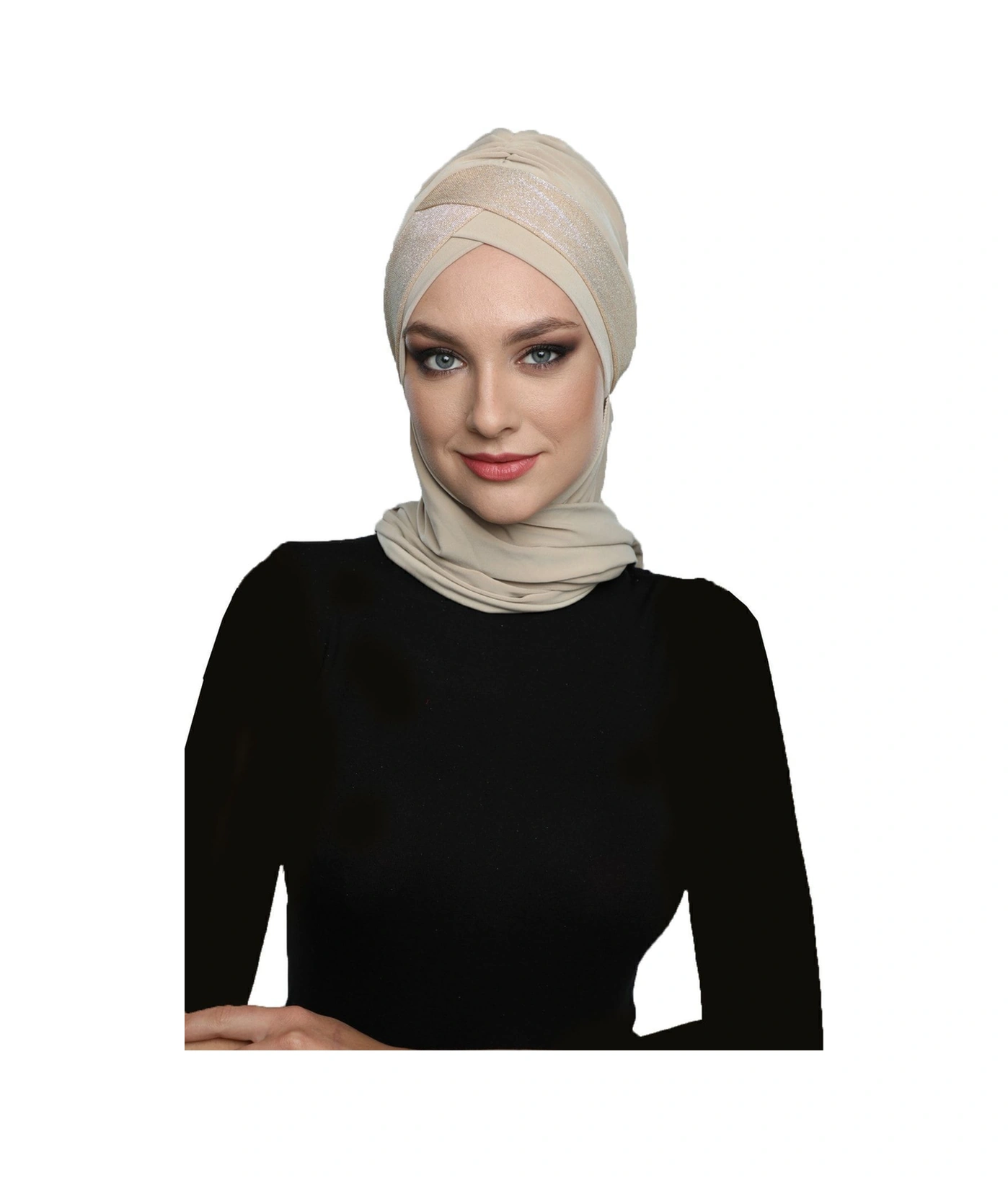 Çapraz Pike Atkılı Astarlı Bej Hazır Türban Tesettür Bone Bej