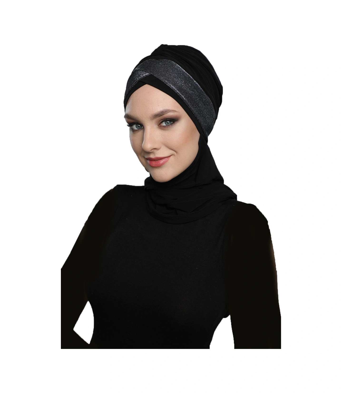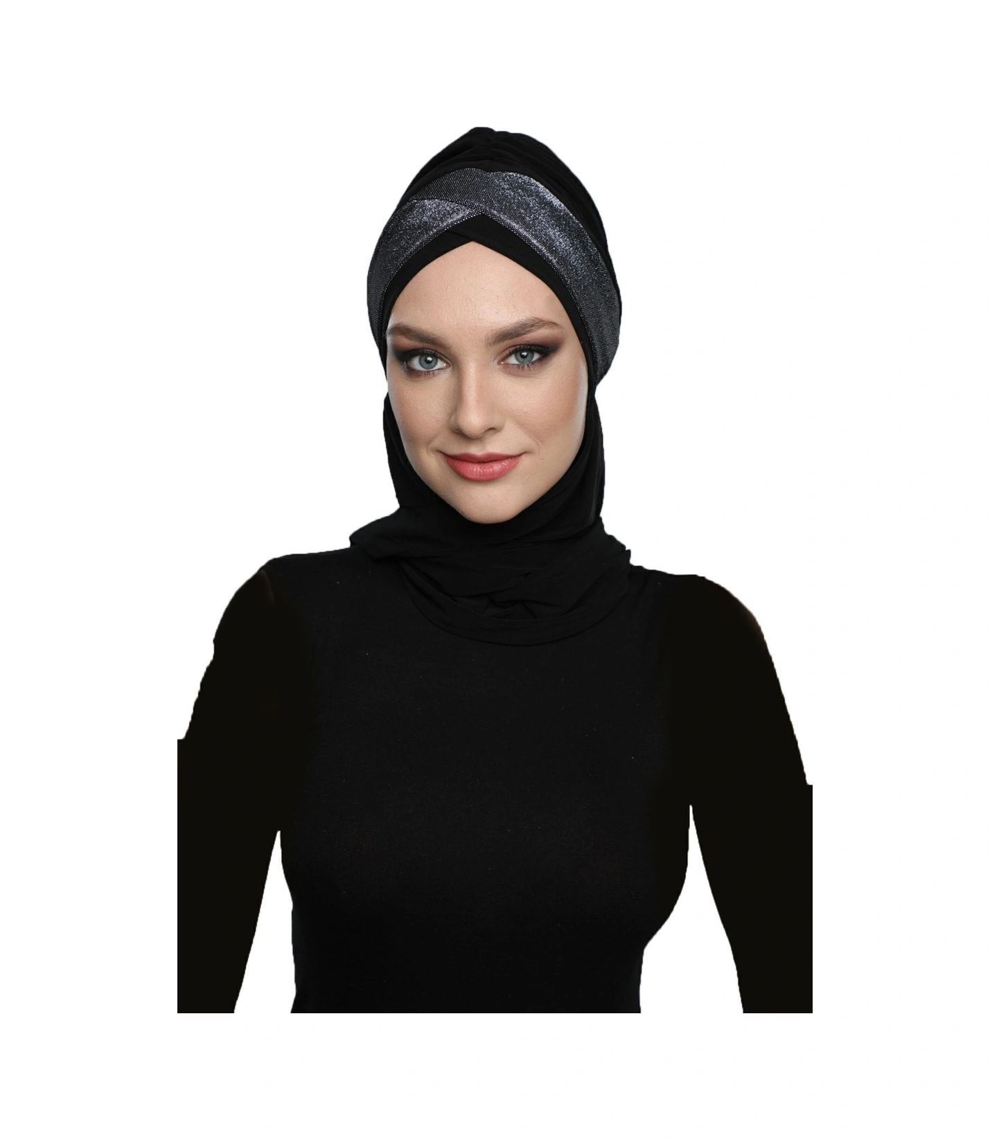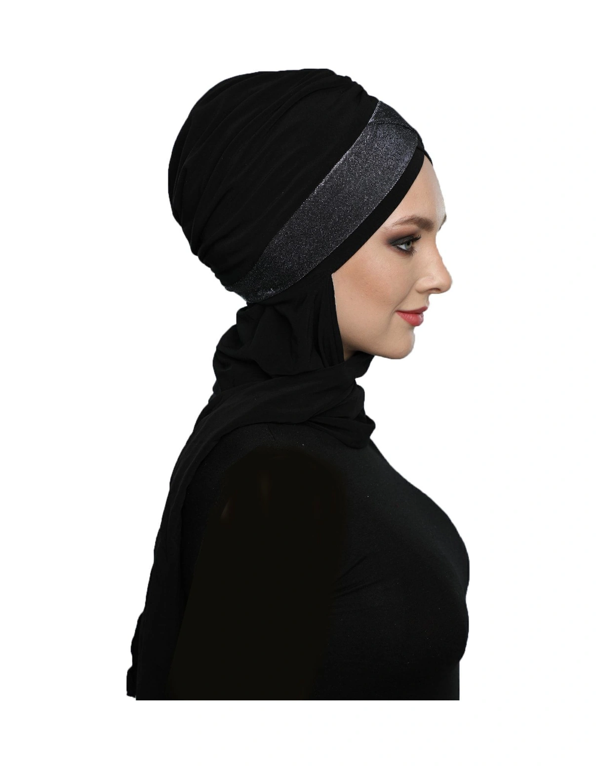 Çapraz Pike Atkılı Astarlı Siyah-gümüş Hazır Türban Tesettür Bone Siyah-gümüş