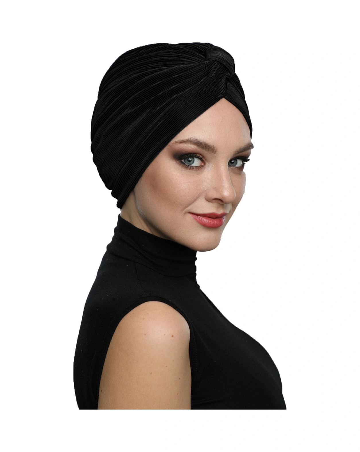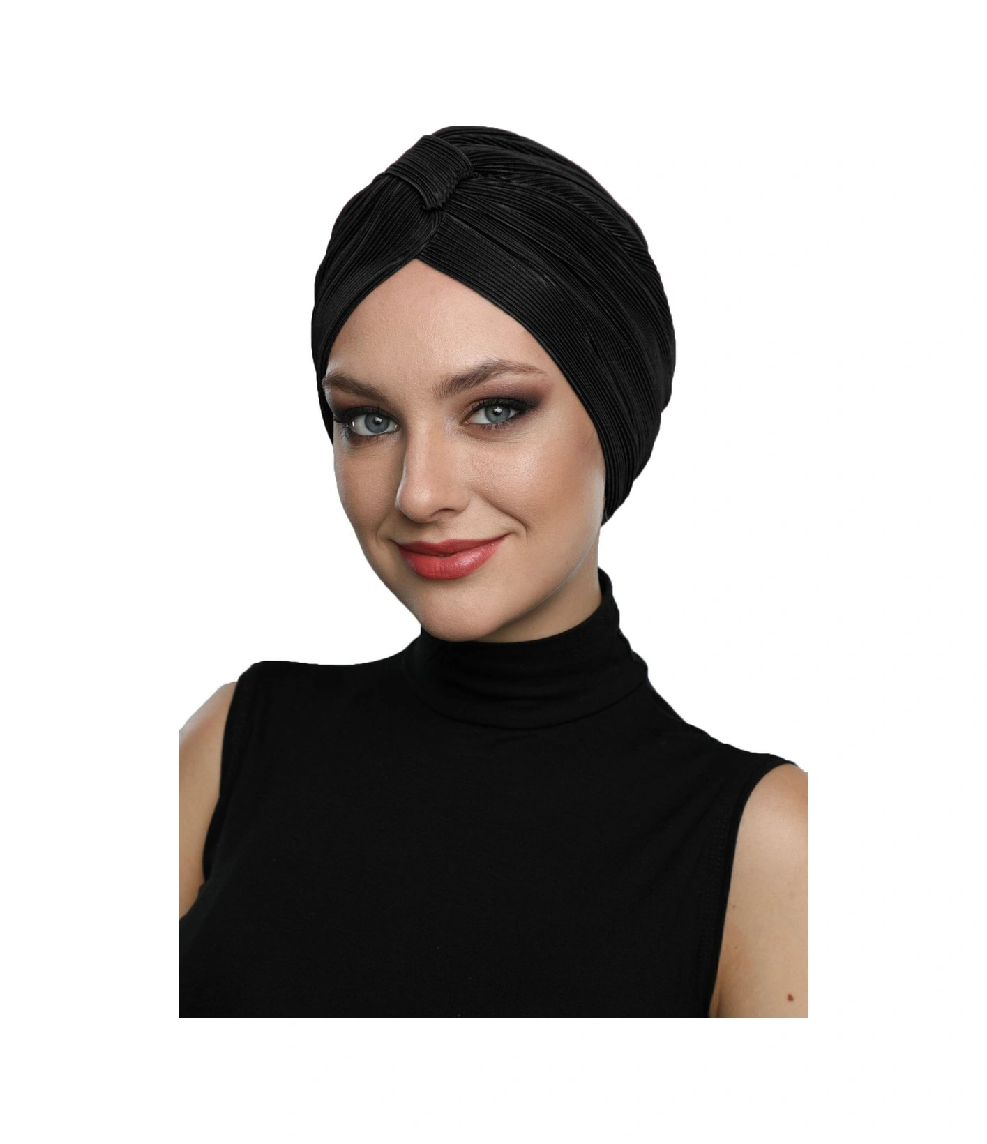 Çapraz Plise Bantlı Astarlı Siyah Hazır Türban Tesettür Havuz Bonesi Siyah