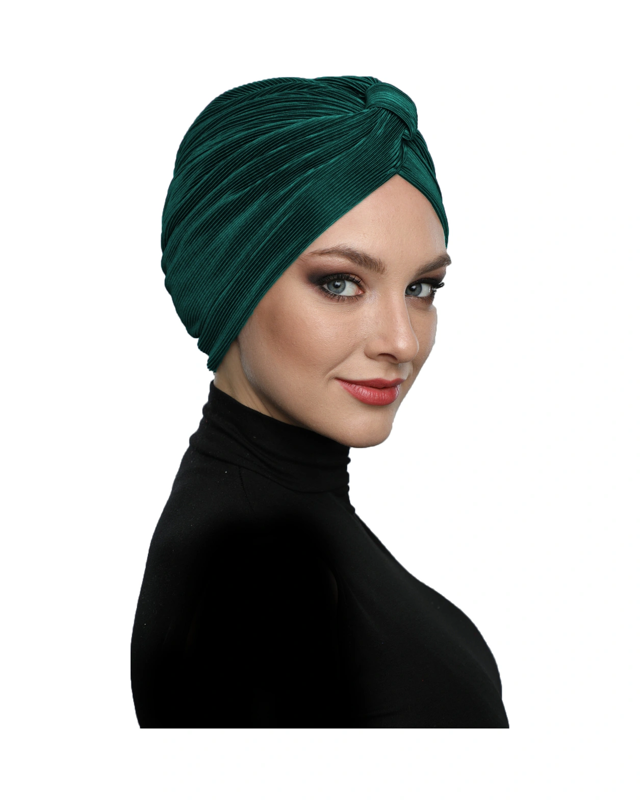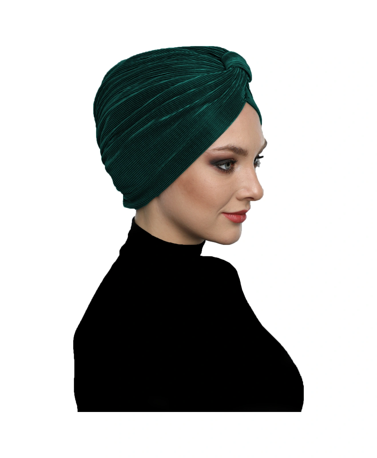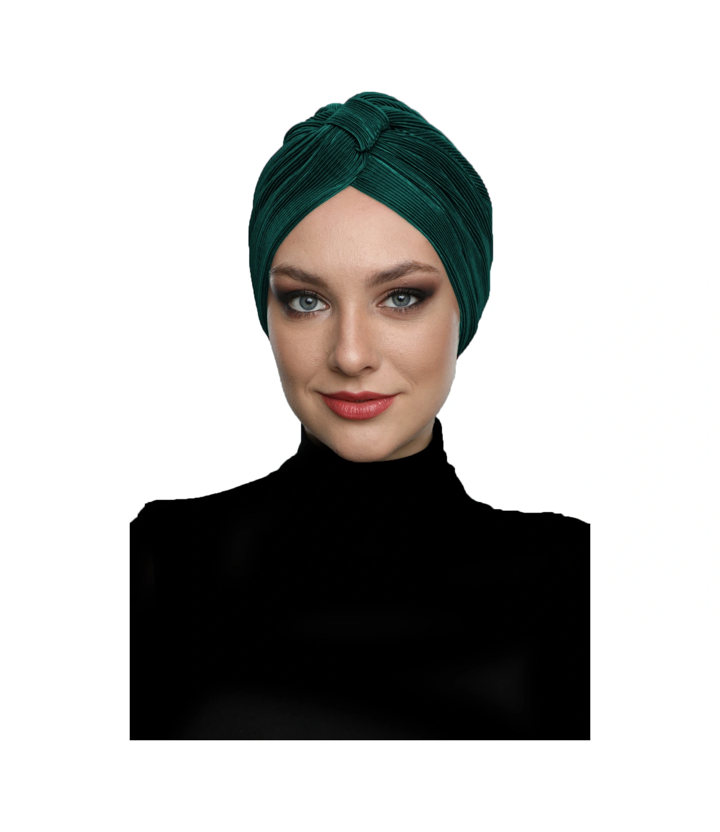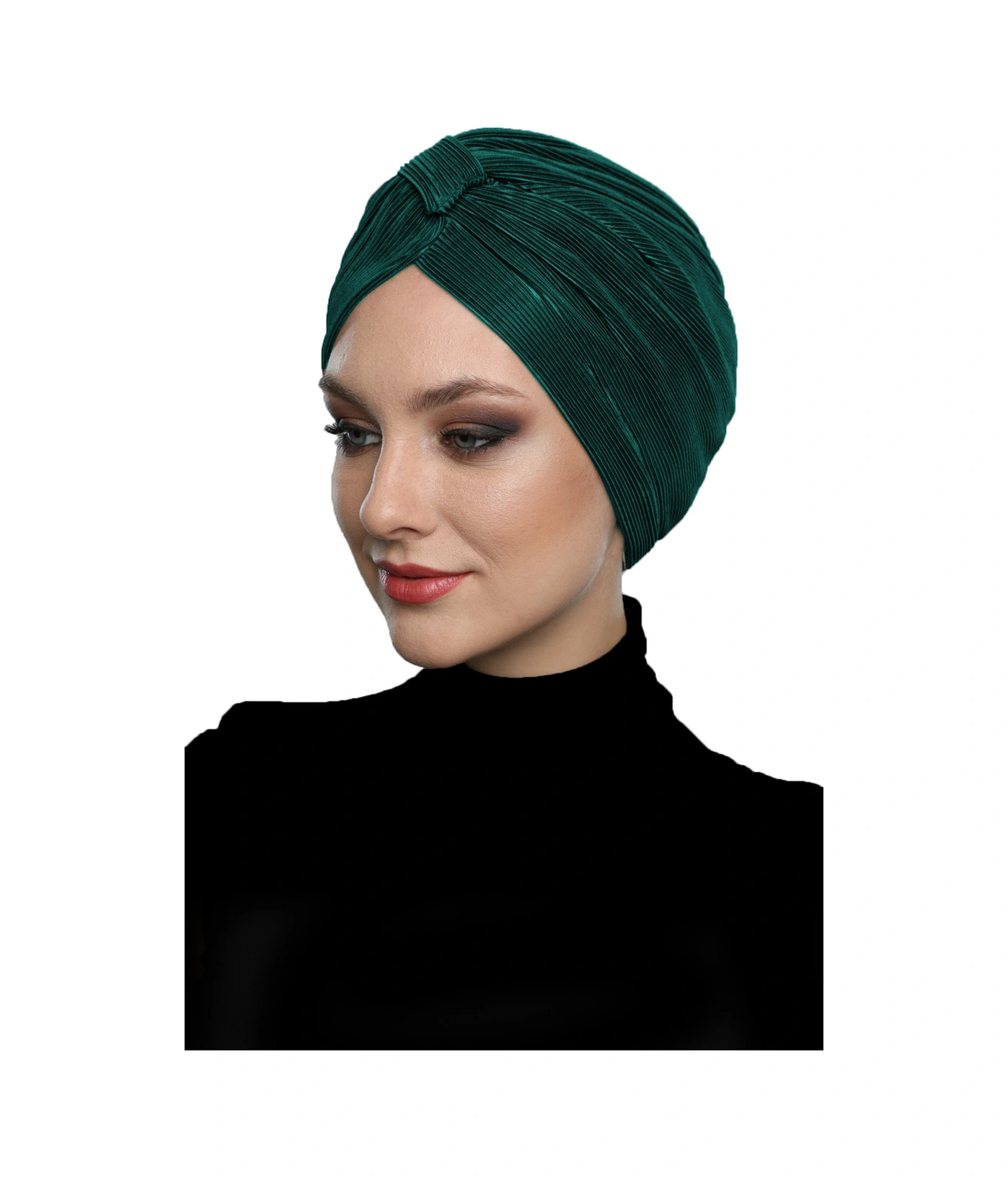 Çapraz Plise Bantlı Astarlı Yeşil Hazır Türban Tesettür Havuz Bonesi Hürrem