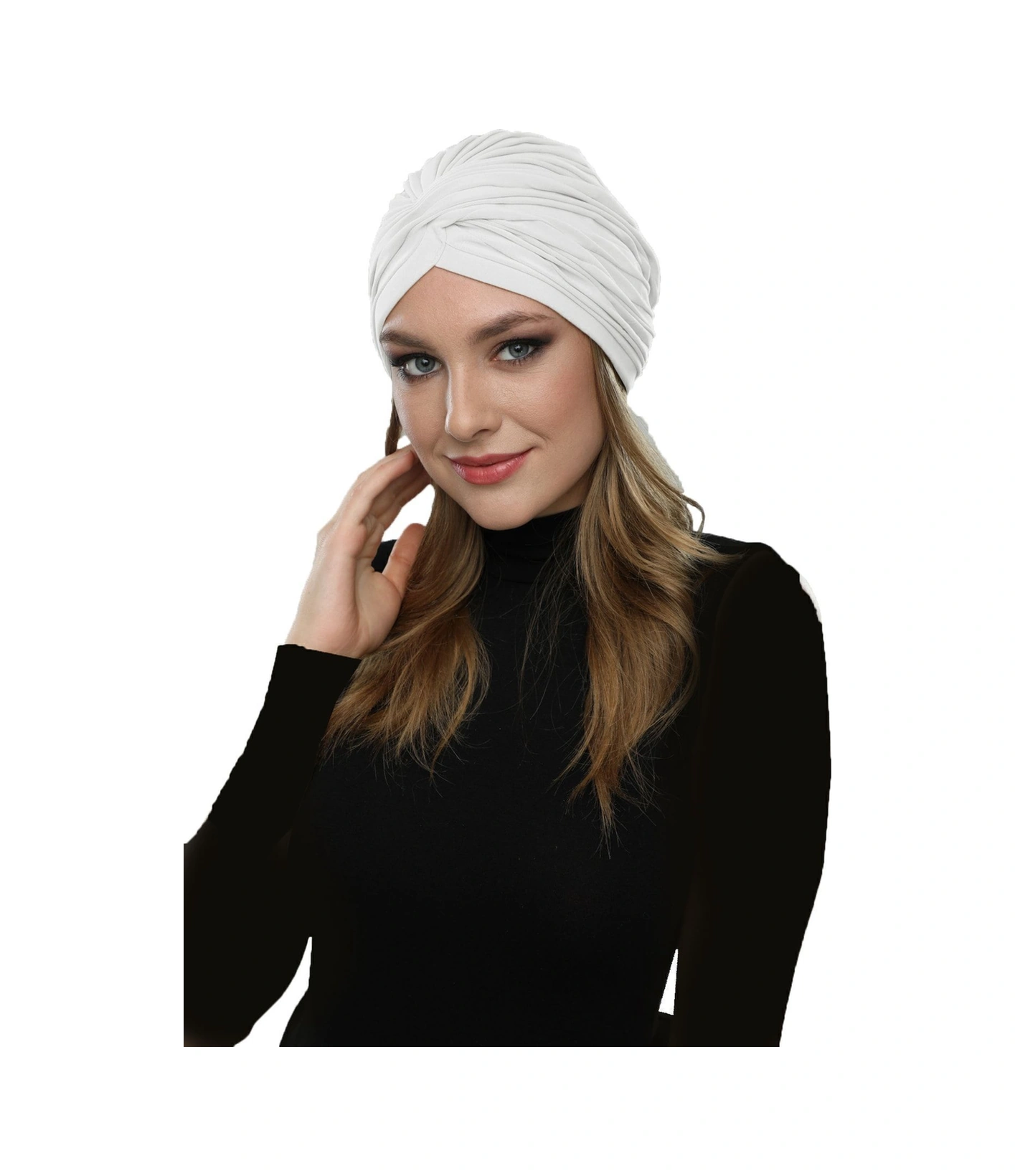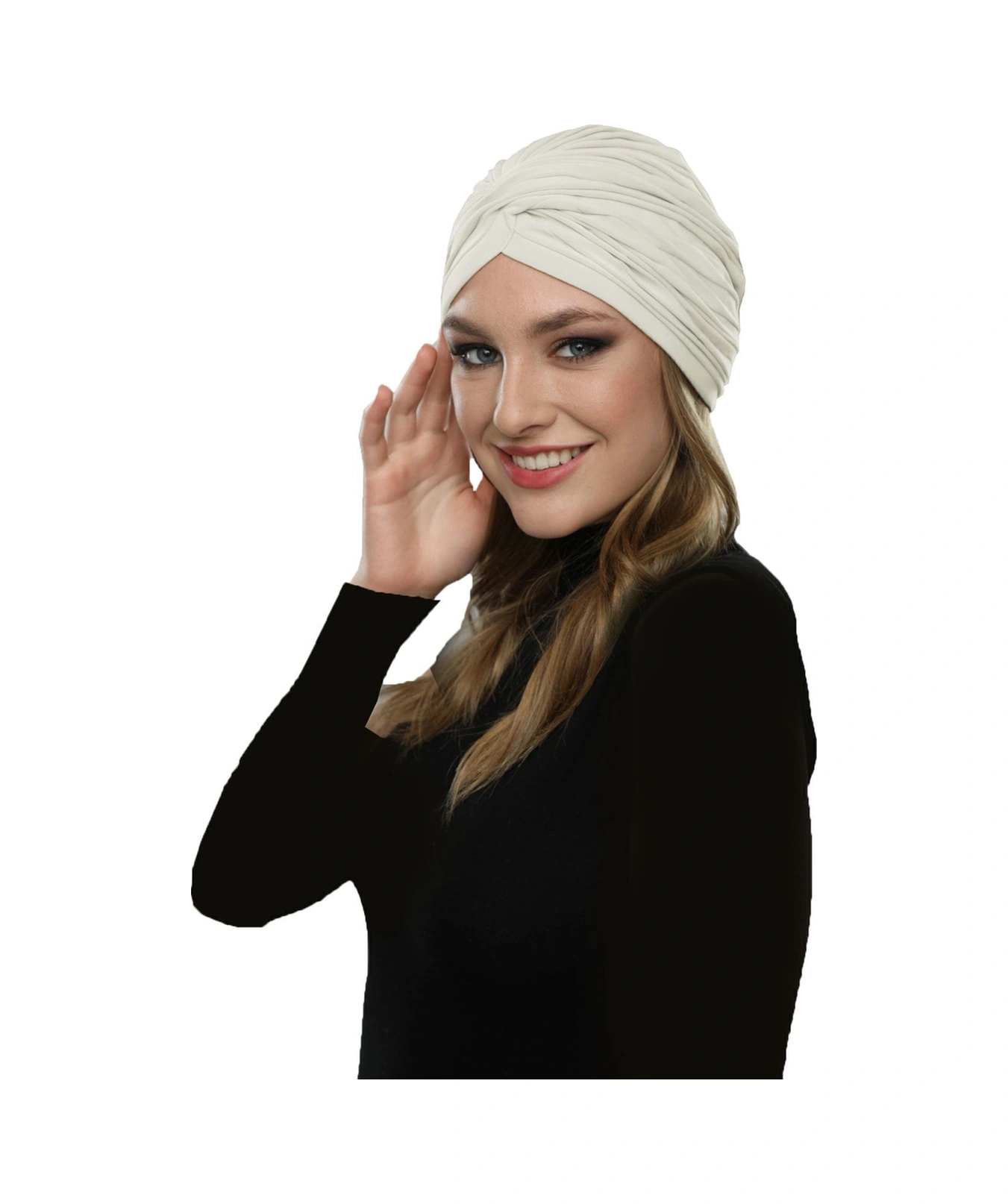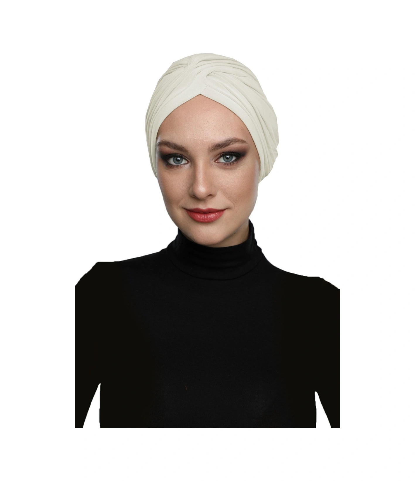 Çapraz W Nervürlü Ensesi Bantlı Krem Hazır Türban Tesettür Havuz Bonesi Krem