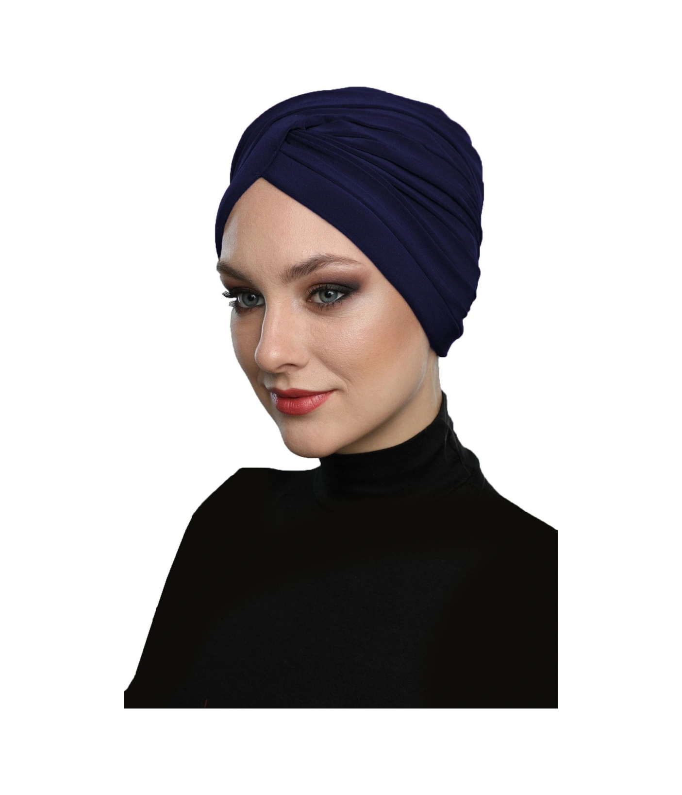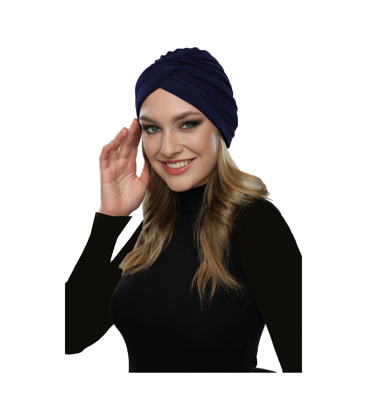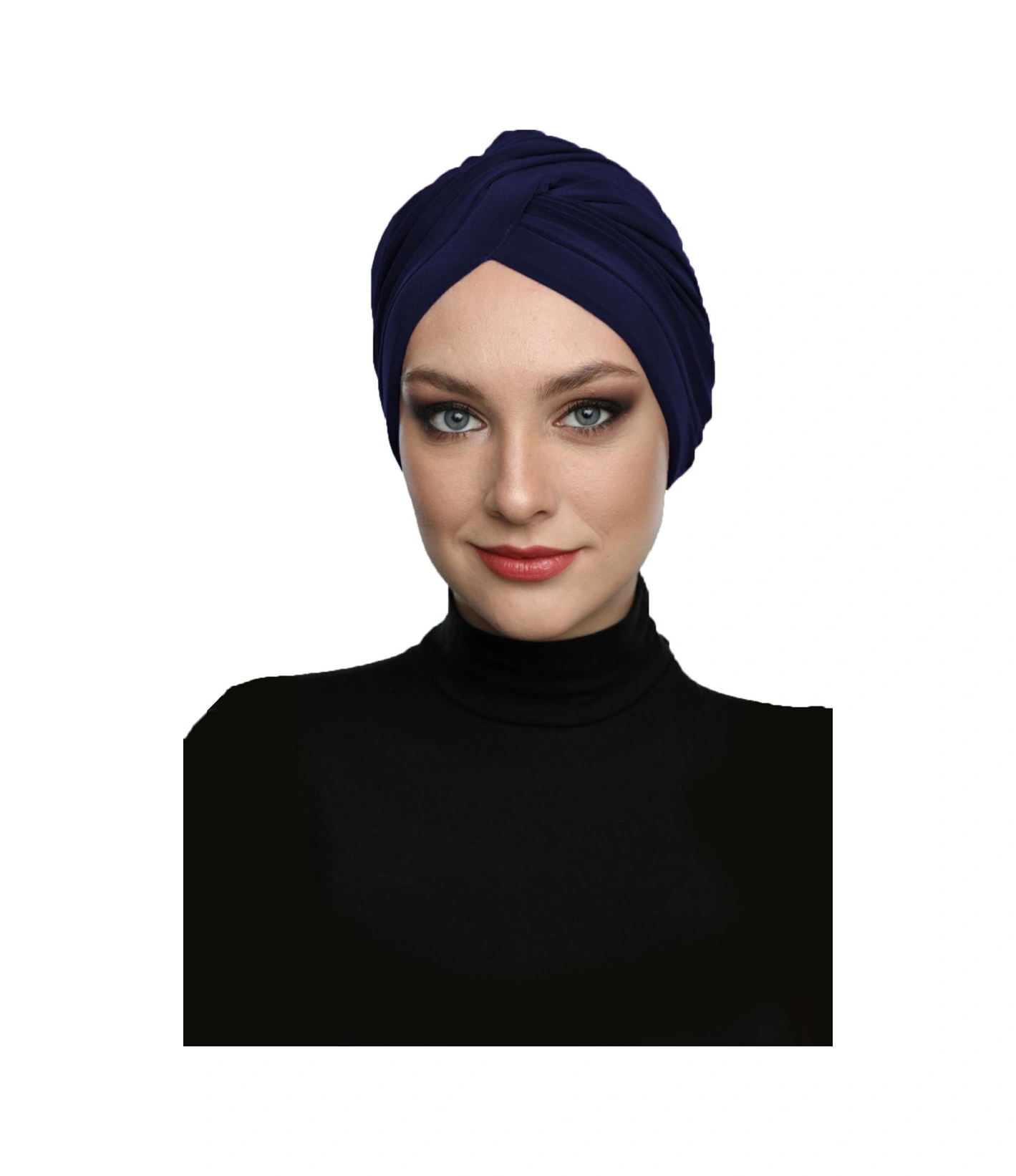Çapraz W Nervürlü Ensesi Bantlı Lacivert Hazır Türban Tesettür Havuz Bonesi Lacivert