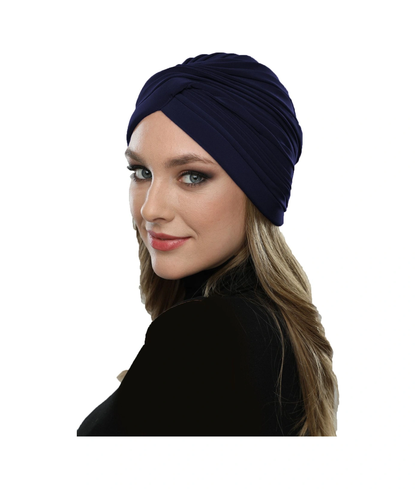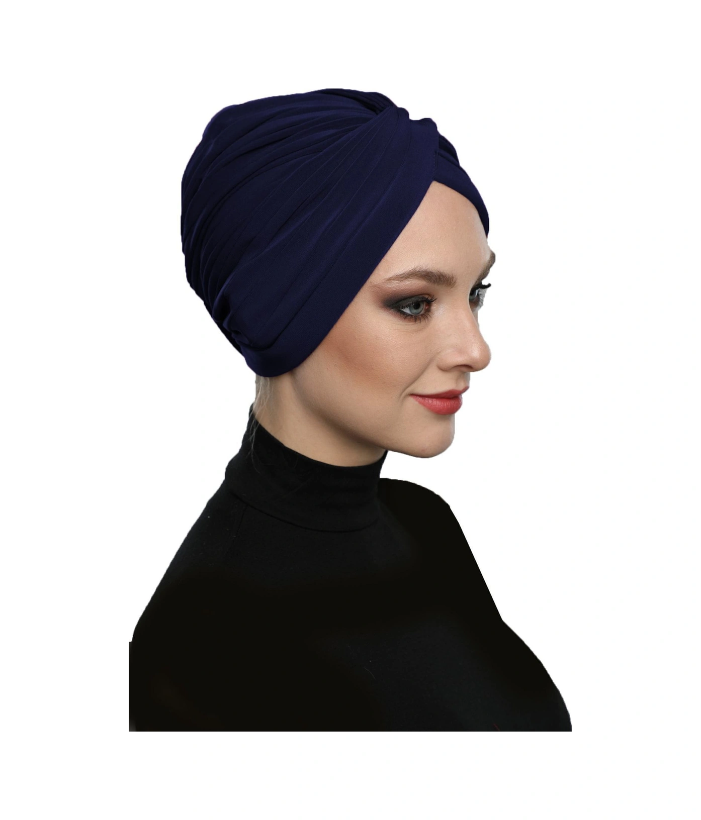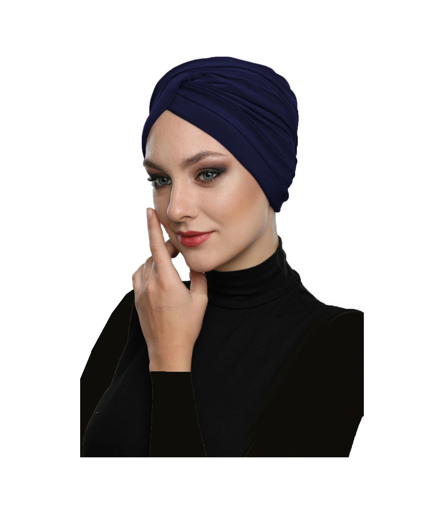 Çapraz W Nervürlü Ensesi Bantlı Lacivert Hazır Türban Tesettür Havuz Bonesi Lacivert