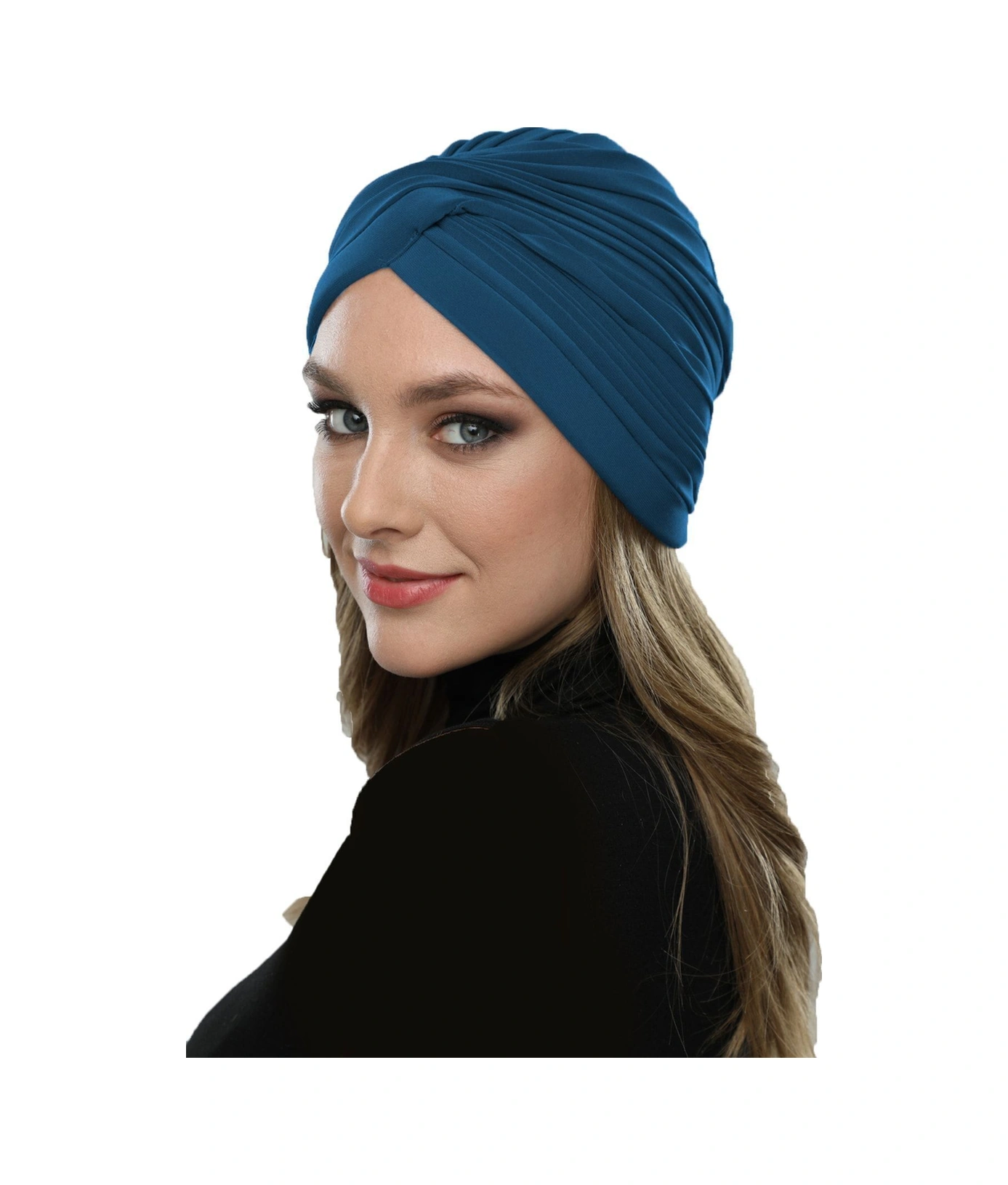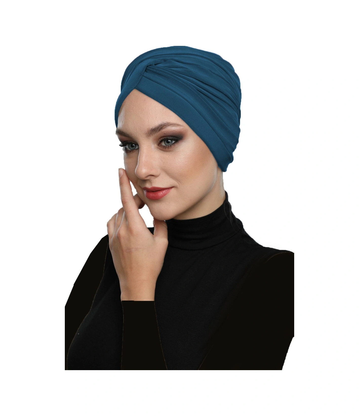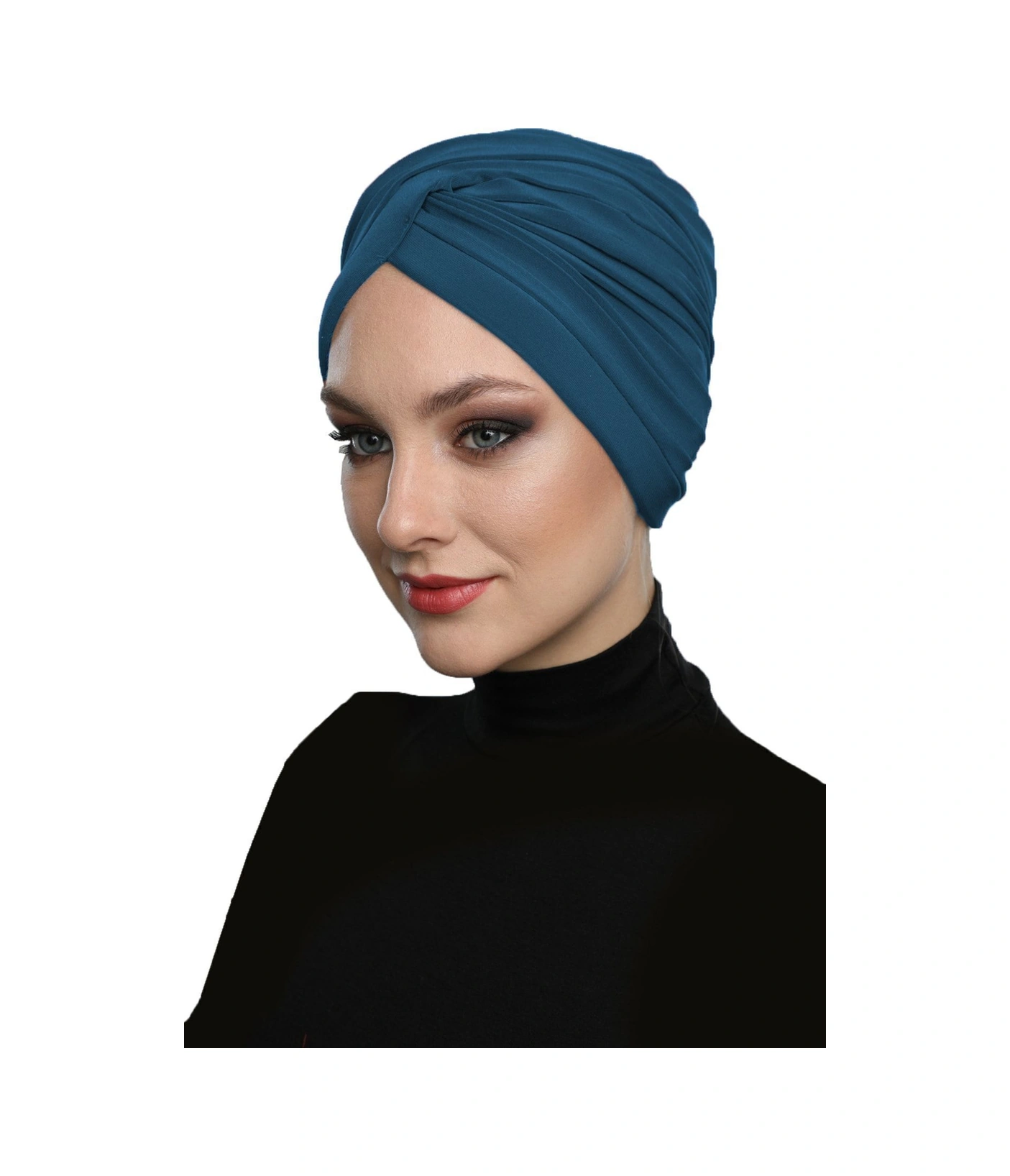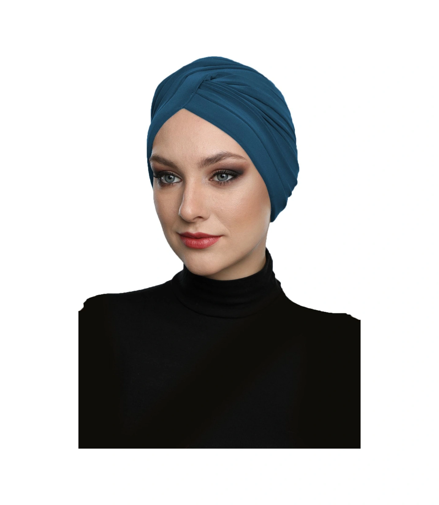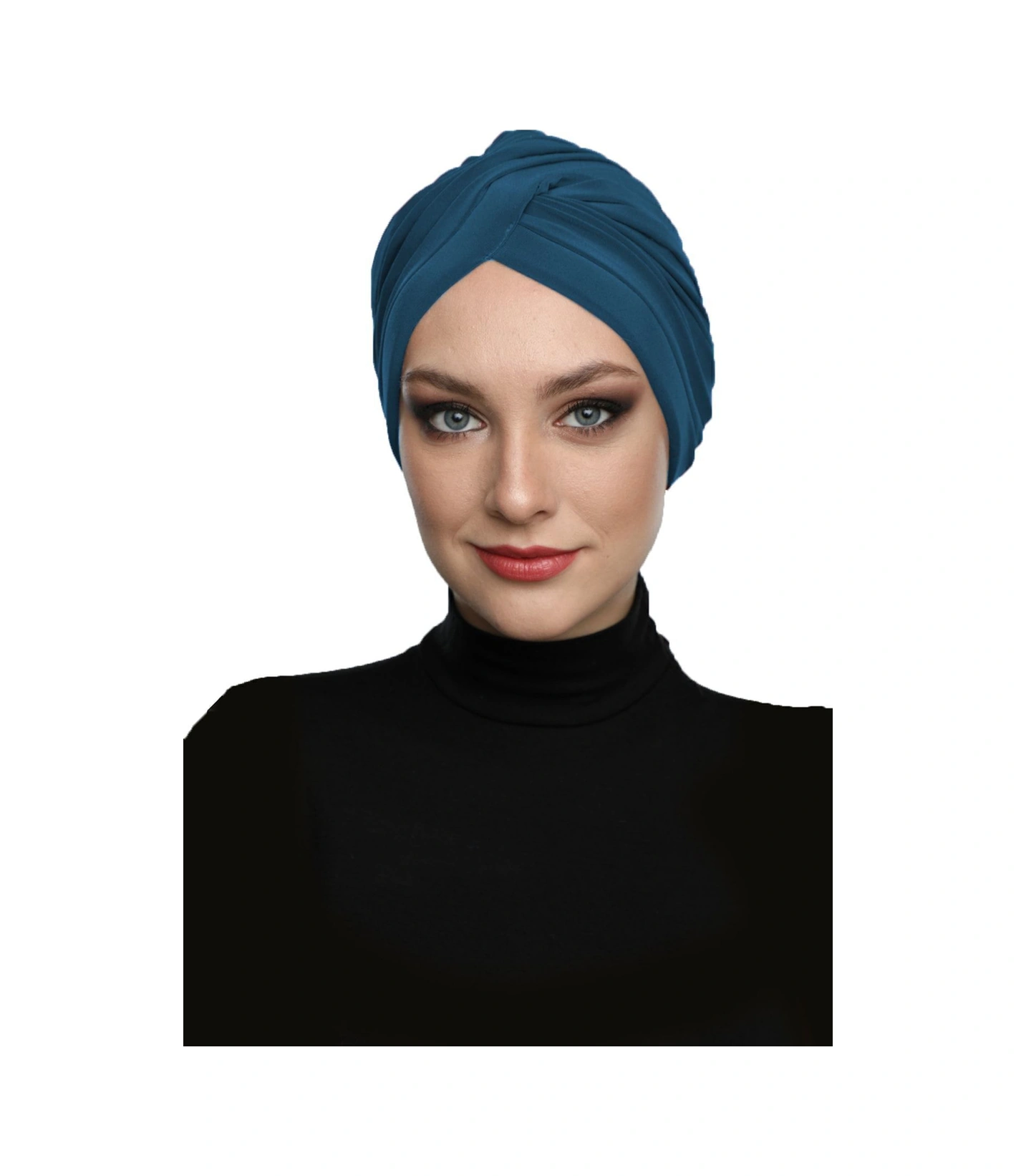 Çapraz W Nervürlü Ensesi Bantlı Petrol Hazır Türban Tesettür Havuz Bonesi Petrol