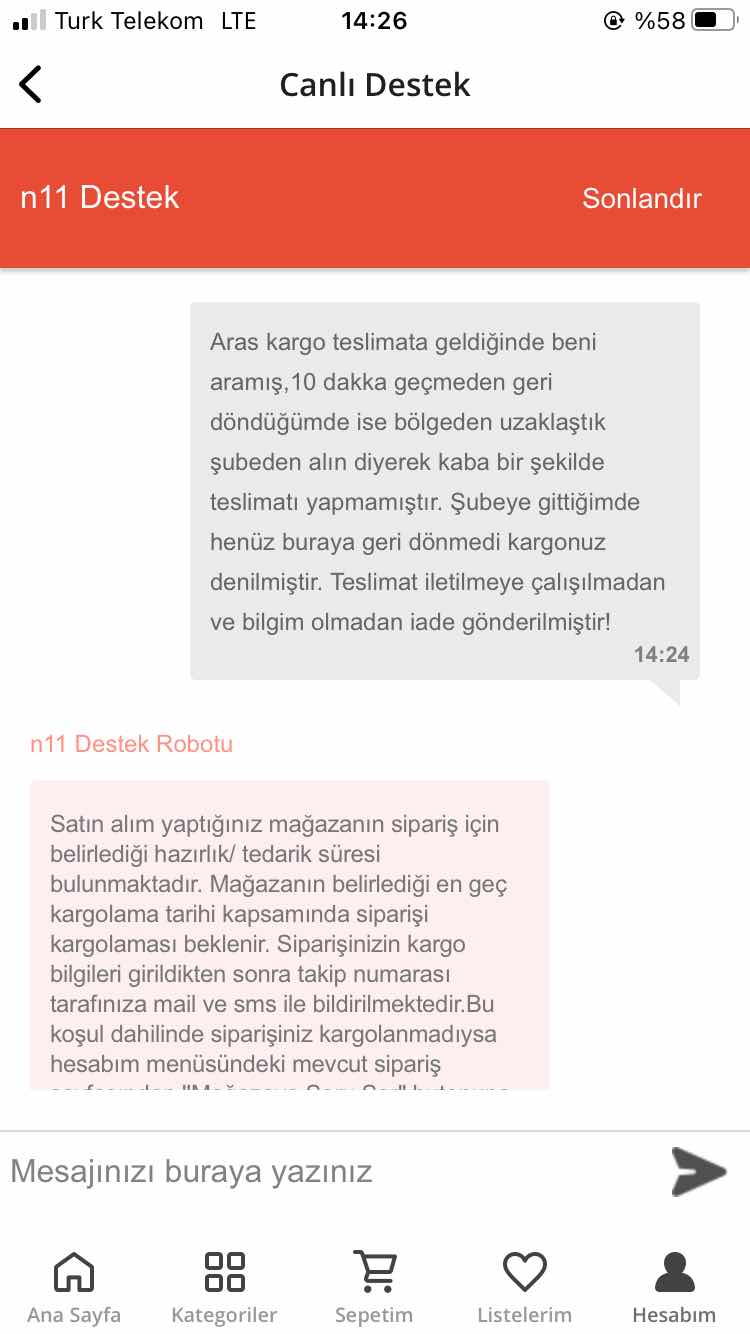 Çalıştığınız “ARAS KARGO” sebebi ile ürün elime ulaşmadan ve bilgim dahilinde olmadan iade yapılmış. Aynı zamanda n11 in destek kısmı, asla tedarikçilerini koruyucu bir sistemde ilerlemiyor. Bilginize.