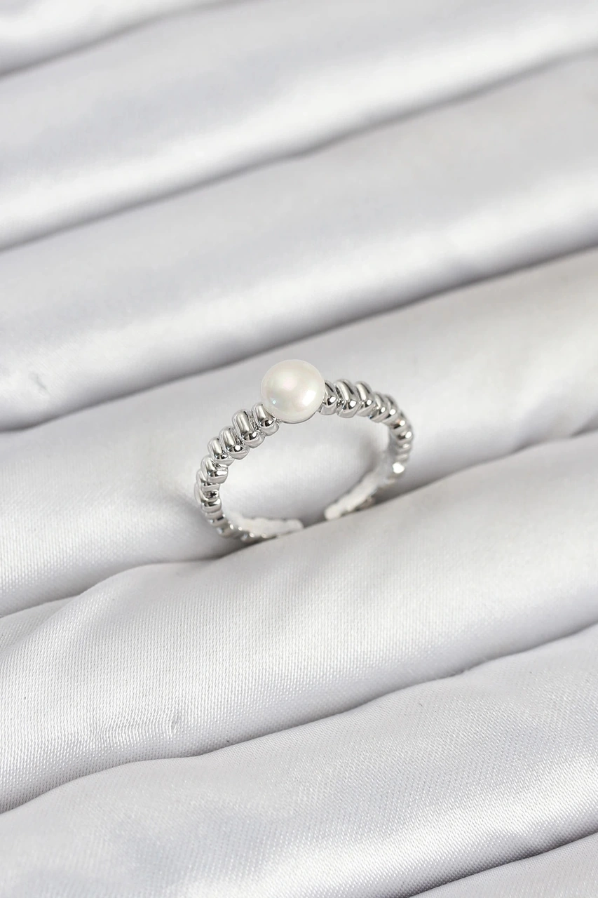 Pirinç Gümüş Renk Zirkon Taşlı Kelebek Model İnci Detay Ayarlanabilir Yüzük - Tj-byk3534