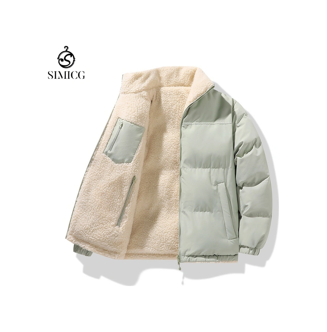 Çift Taraflı Düz Renk Dik Yaka Artı Kadife Kalın Sıcak Erkek Pamuklu Ceket AÇIK YEŞİL