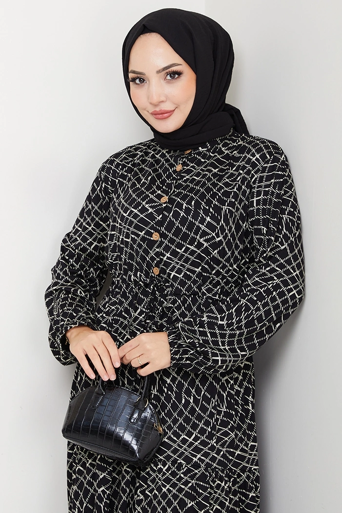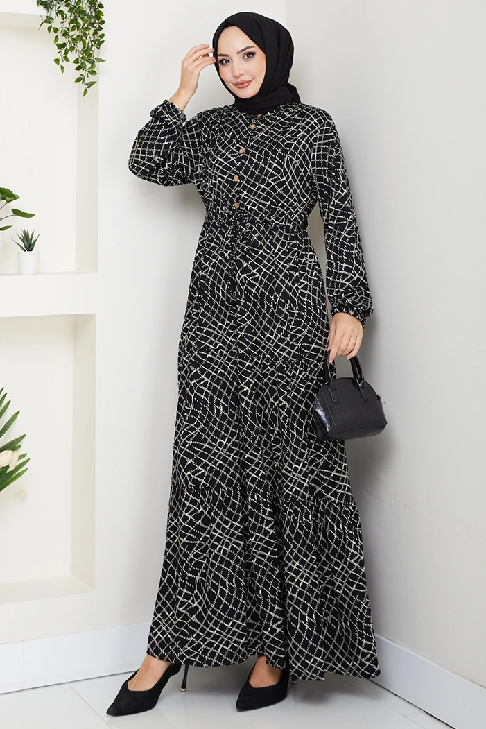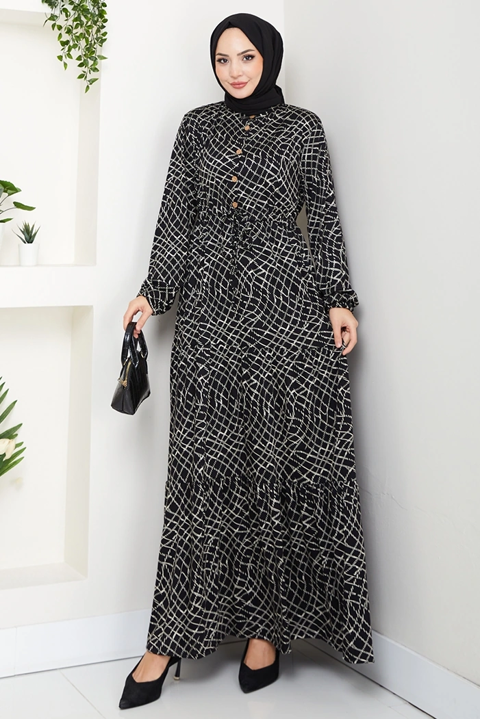 Çizgi Desen Yarım Düğmeli Elbise 1630 - Siyah Siyah