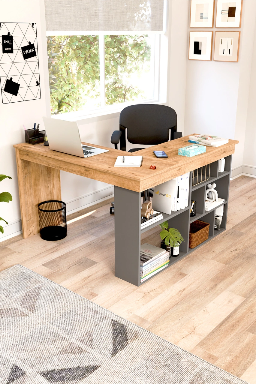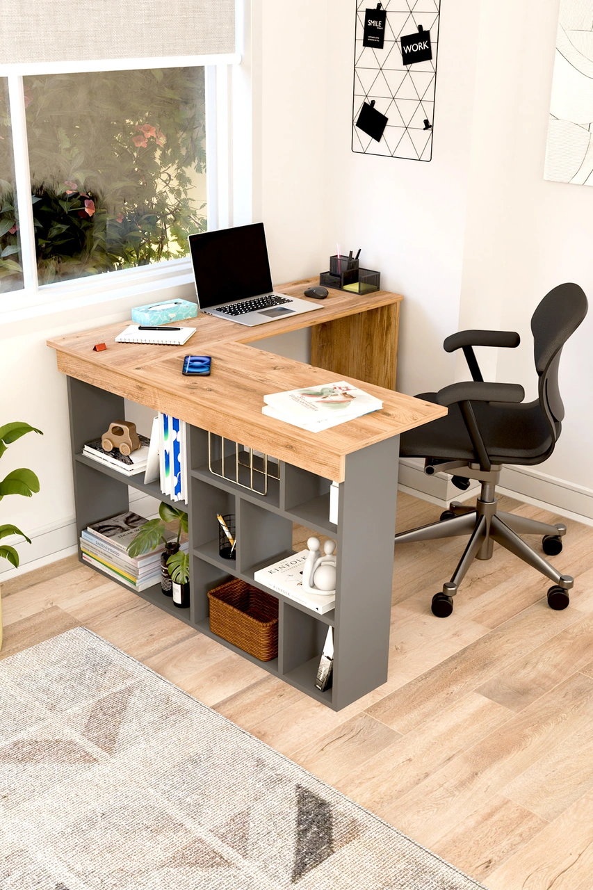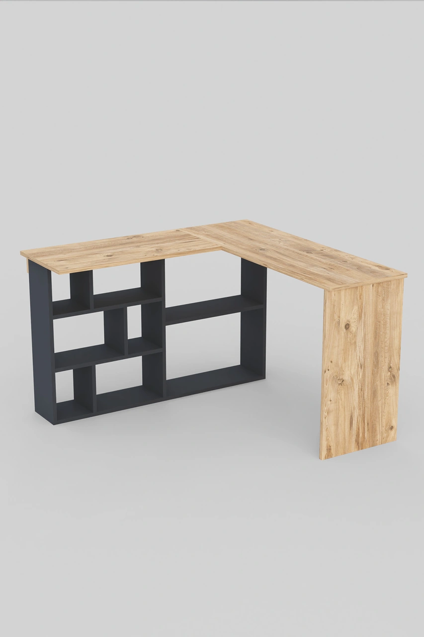 Corn Köşe Çalışma Masası Raflı Bilgisayar, Ofis Masası Atlantik Çam - Antrasit Gri Atlantik Çam - Antrasit