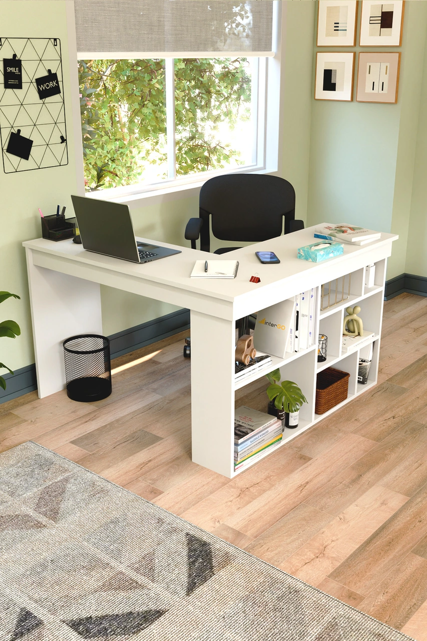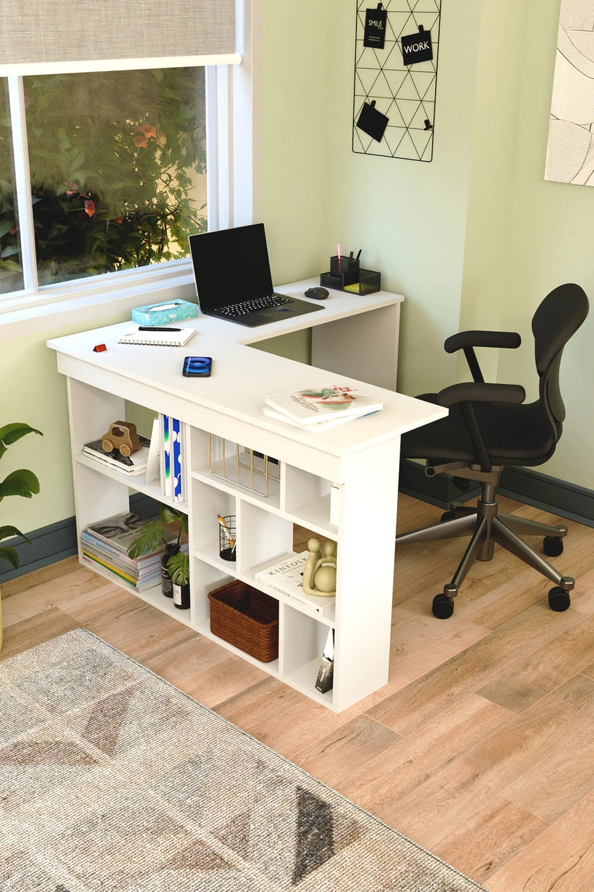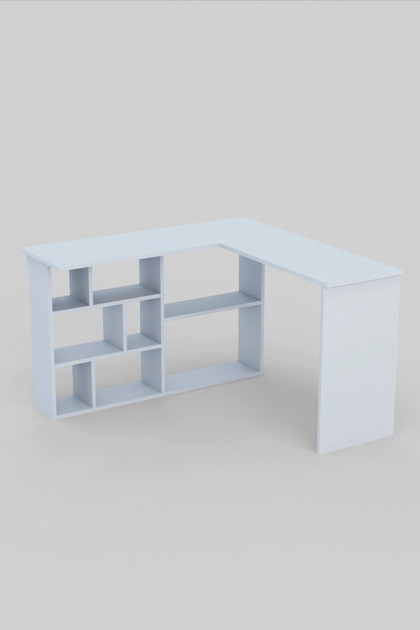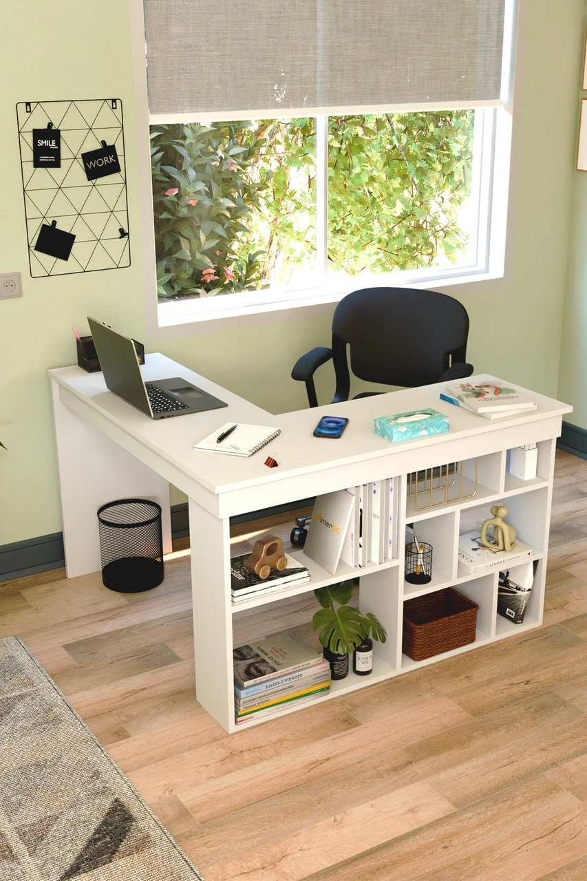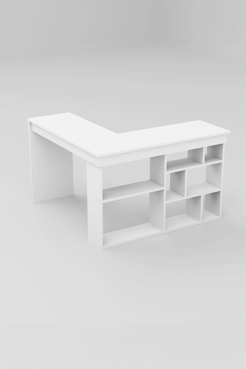 Corn Köşe Çalışma Masası Raflı Bilgisayar, Ofis Masası Beyaz Beyaz