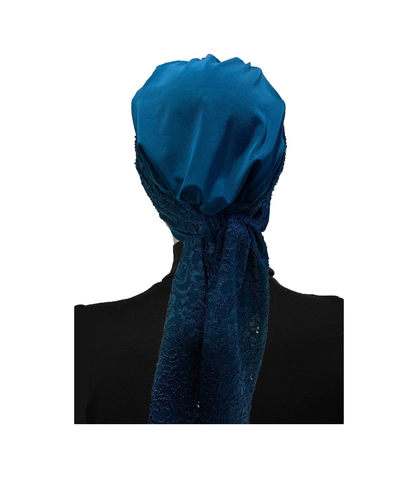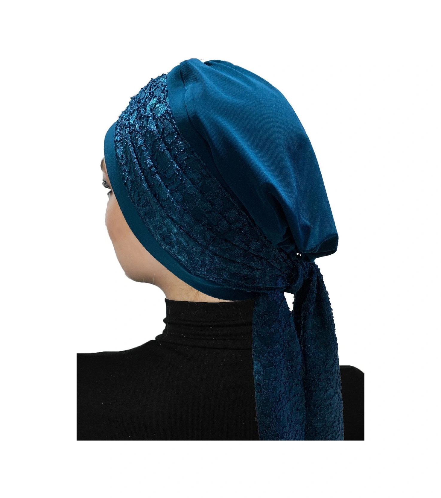 Dantel Bandana Petrol Hazır Türban Tesettür Bone Petrol