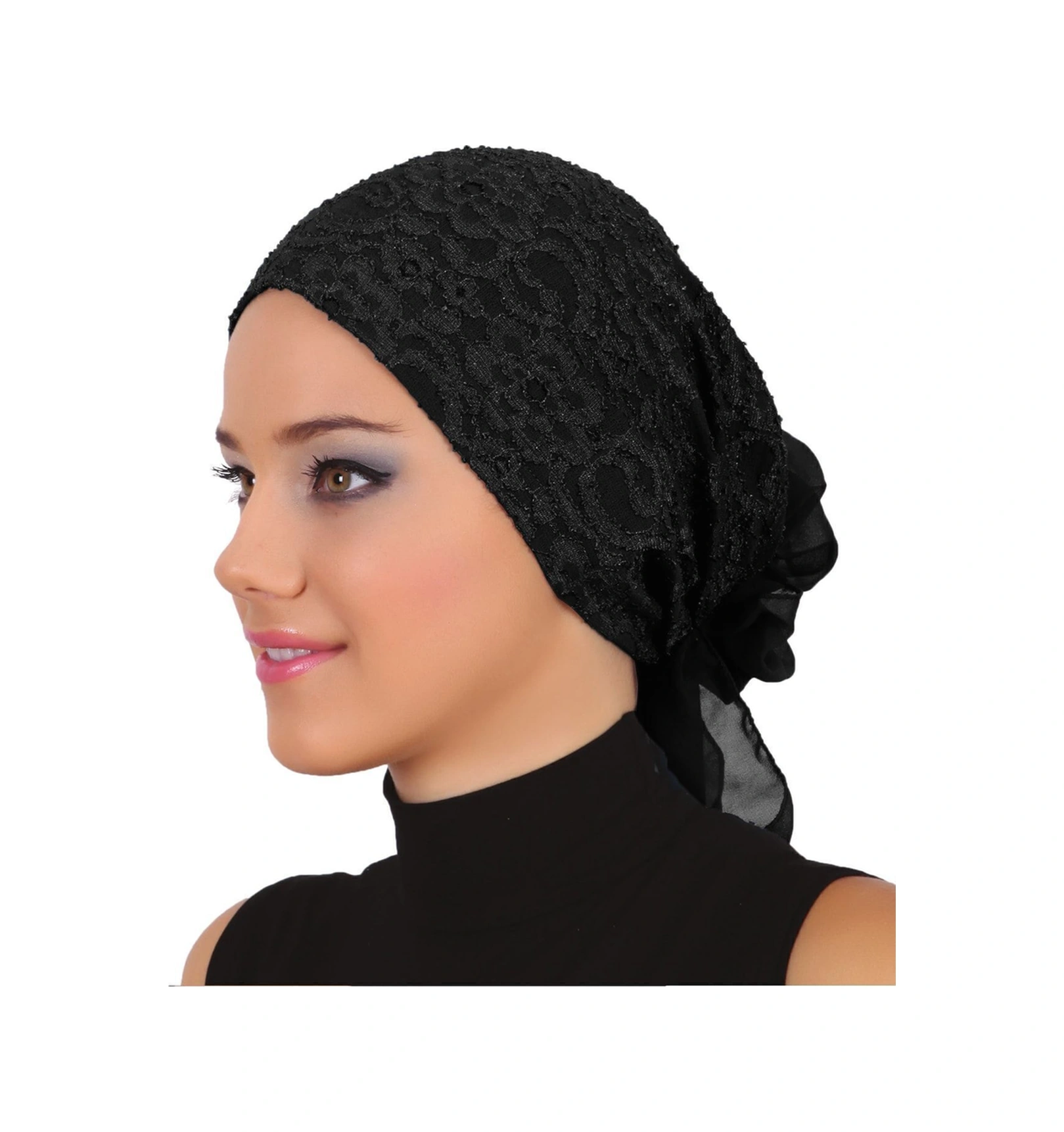 Dantel Tüllü Siyah Hazır Türban Tesettür Bone Siyah