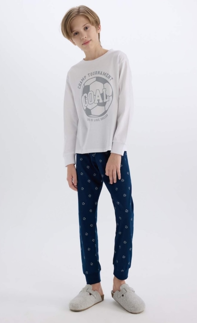 DeFacto Erkek Çocuk Pijama Takımı Bisiklet Yaka Baskılı Uzun Kollu Üst Desenli Alt D5215A824WNWT34