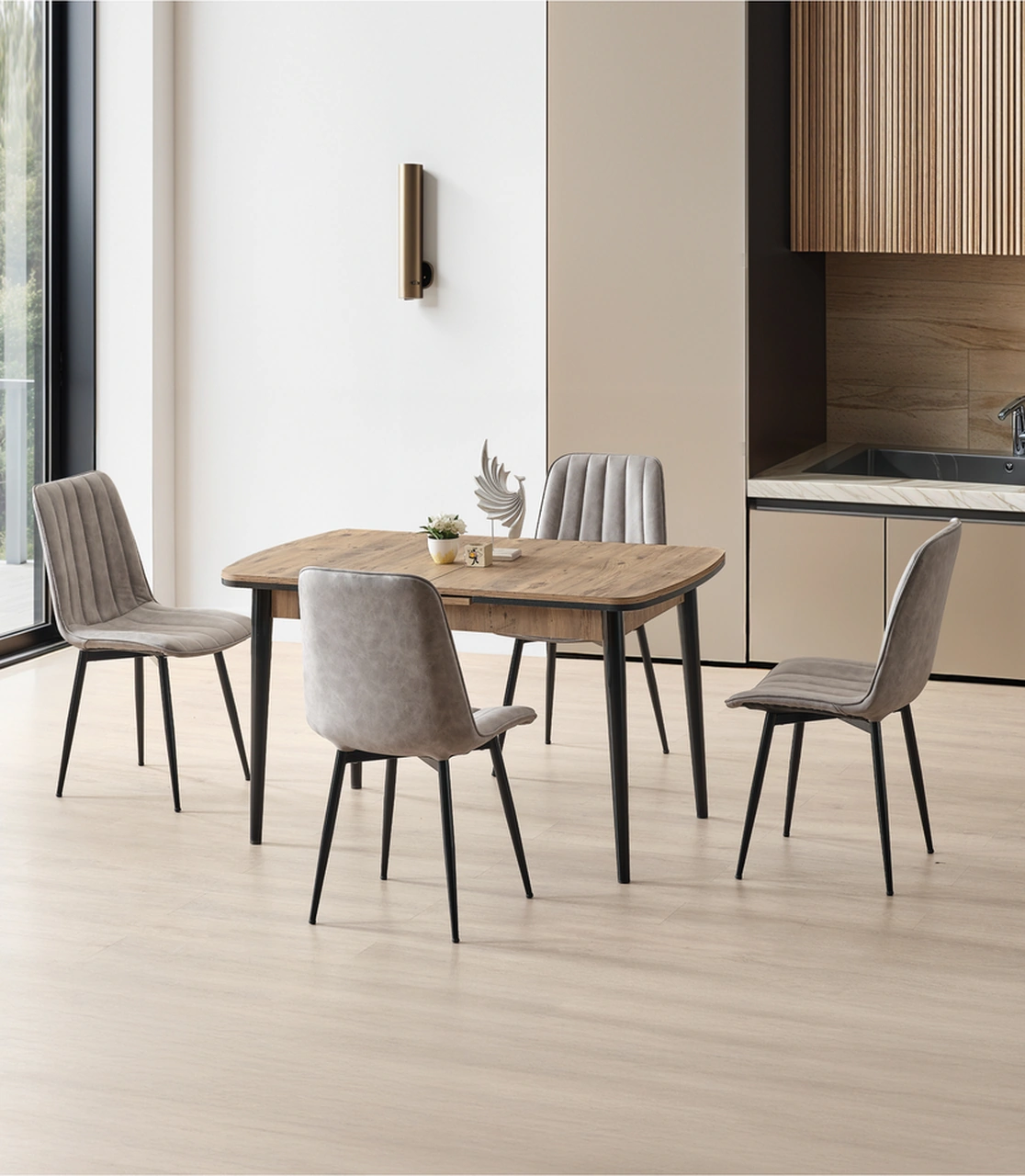 Dengema Berlin 87 Açılır Masa Takımı Ceviz Desen, Siyah Ayak, 80 130 180 Cm, 4 Togo Sandalyeli Ceviz Desen - Siyah Ayak