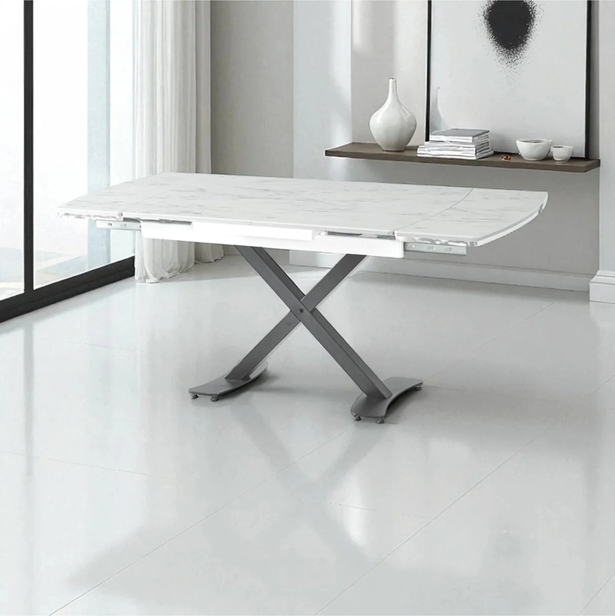 Dengema Diamond Açılır Kapanır Masa Beyaz Mermer, Siyah Ayak, 80 120/180 Cm, 4 6 Kişilik Sandalyesiz Beyaz Mermer - Siyah Ayak
