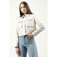 Kapüşonlu Düğmeli Peluş Mont - Kadın Beyaz