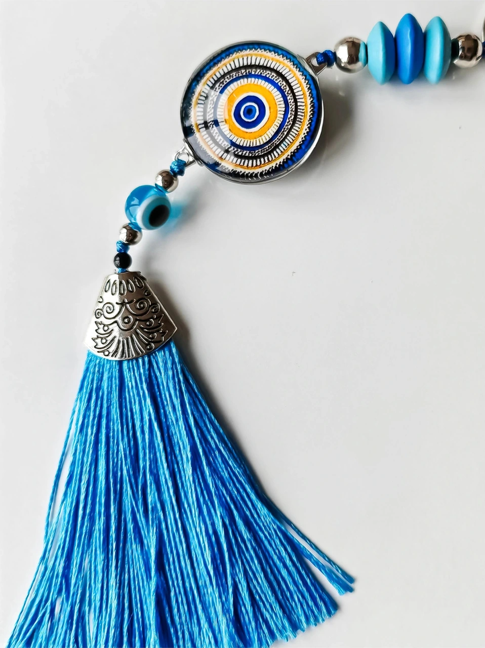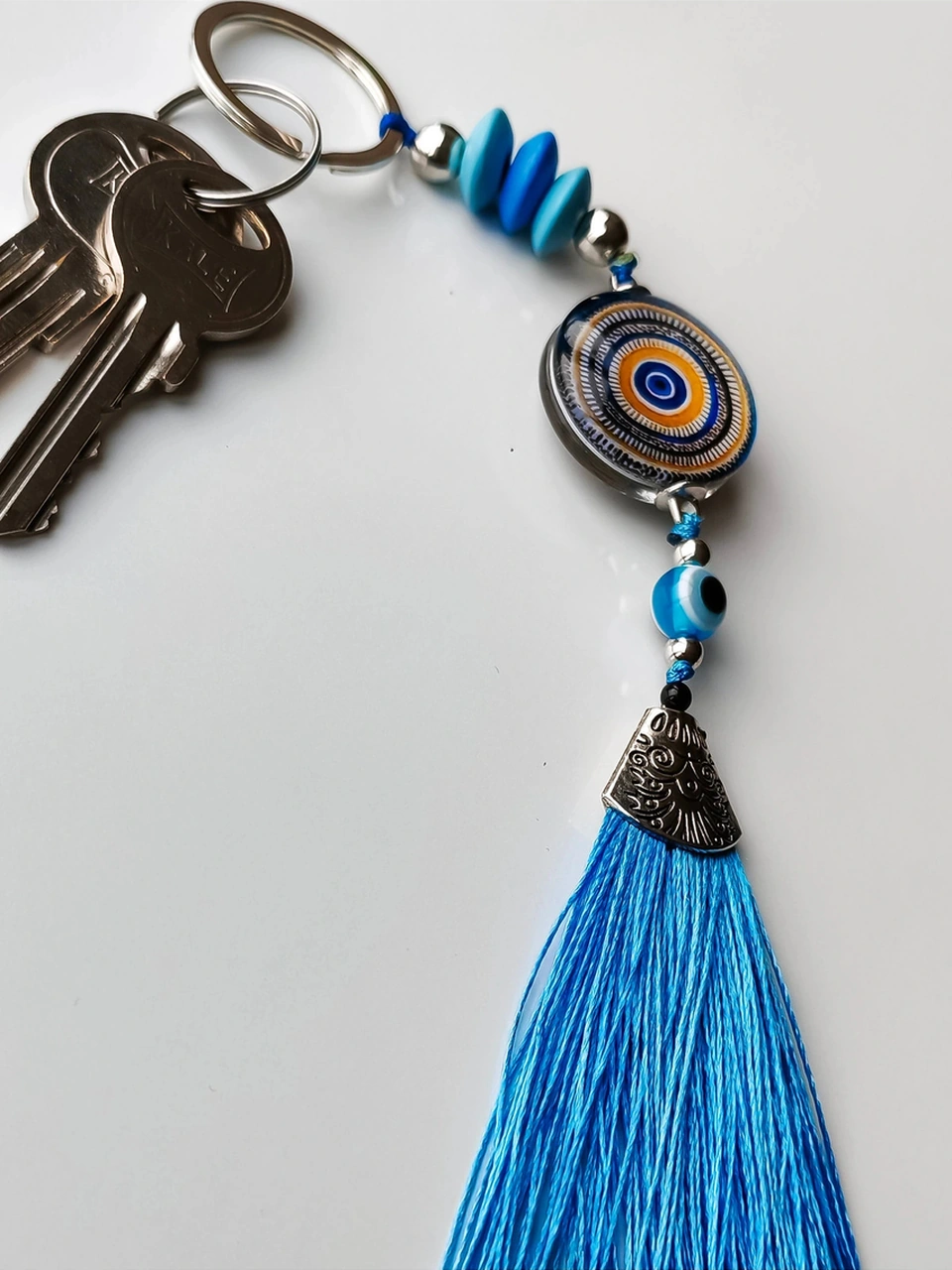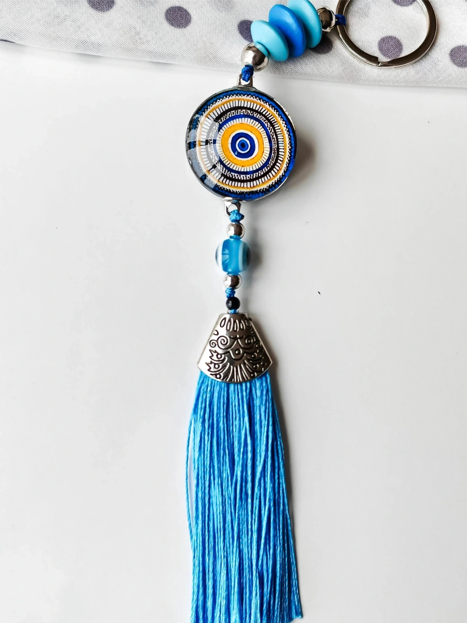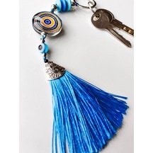 Desenli Cam Boncuklu Mavi Püsküllü Anahtarlık