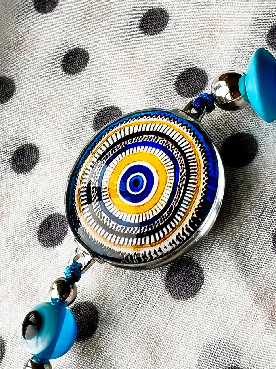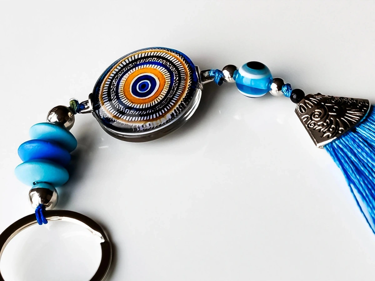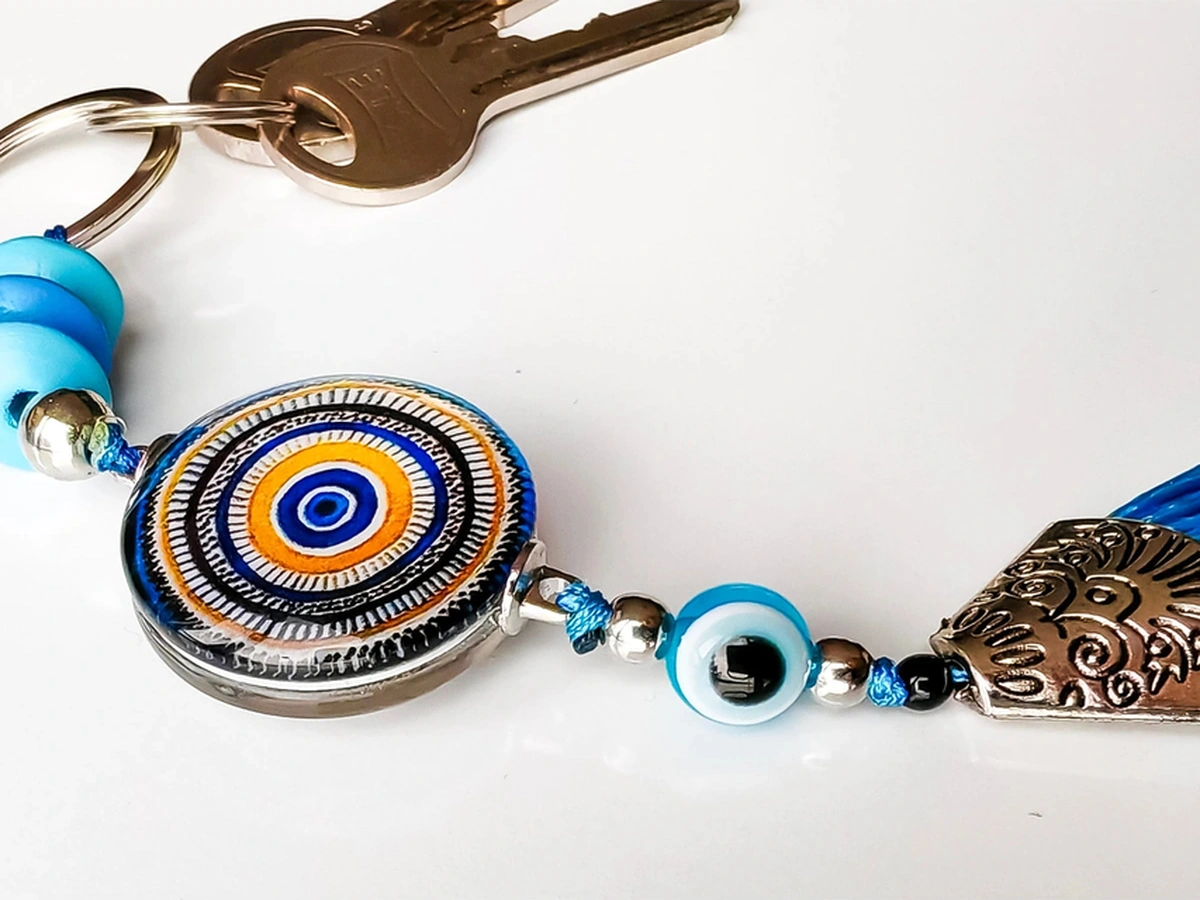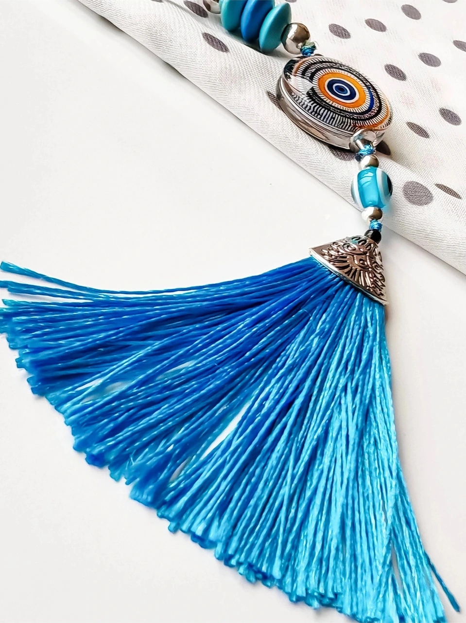 Desenli Cam Boncuklu Mavi Püsküllü Anahtarlık