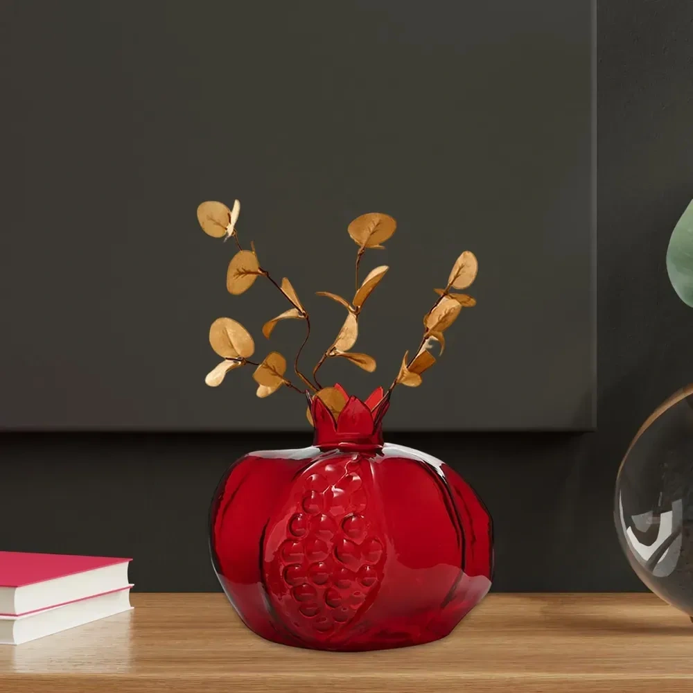 Dianziye Kırmızı Cam Nar Şekilli Dekoratif Vazo - Masaüstü Su Bitkileri, Yapay Çiçekler İçin Sabit Tabanlı Küçük Süs Vasıtası