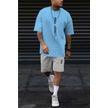 Dikey T-shirt Şort - Bebe Mavi Gri Alt Üst Kombin Şort Tişört Takım Baskılı Oversize Bisiklet Yaka Bebe Mavi Gri