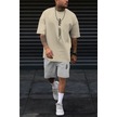 Dikey T-shirt Şort - Vizon Gri Alt Üst Kombin Şort Tişört Takım Baskılı Oversize Bisiklet Yaka Vizon