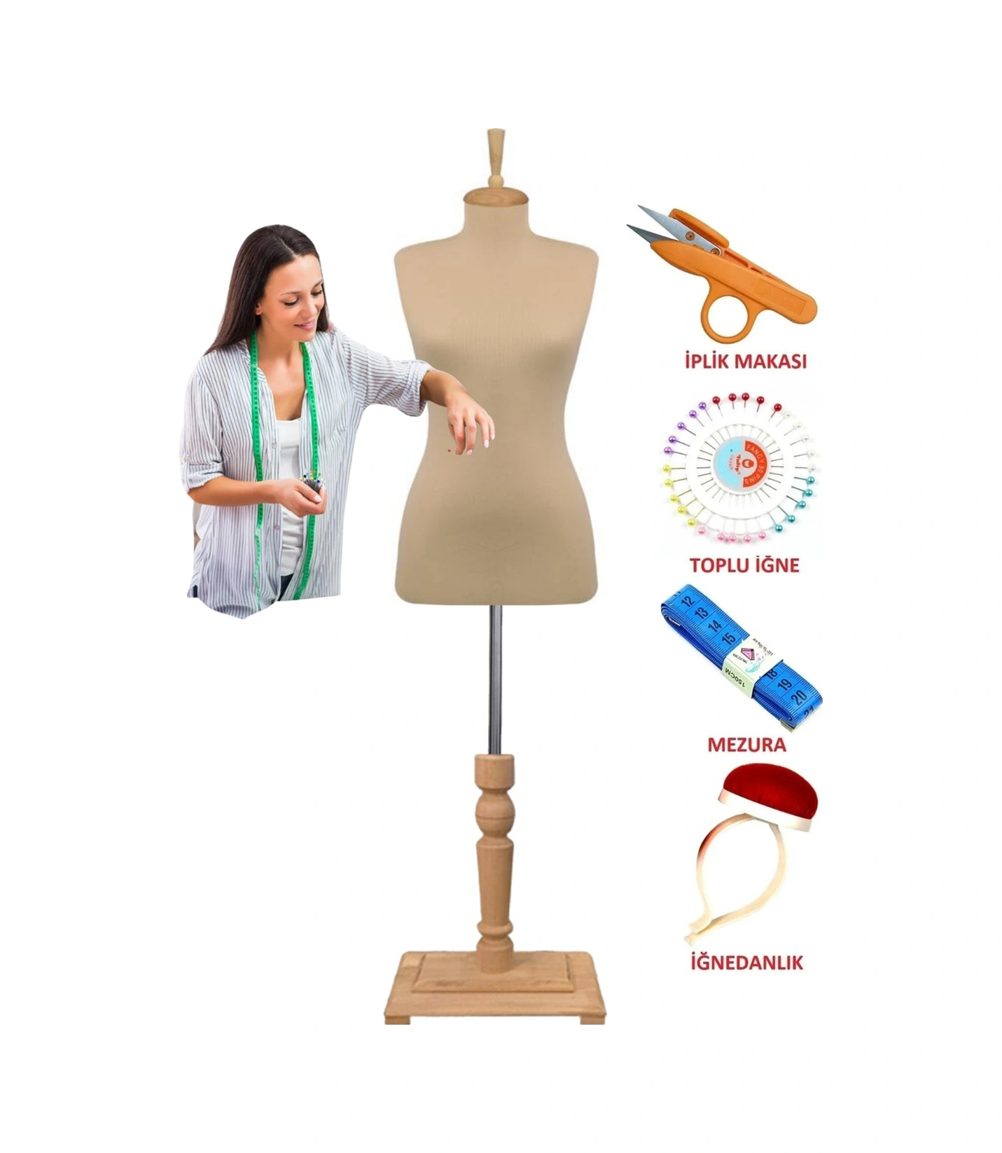 Dikiş Setli Özel Ahşap Mobilya Ayaklı 40 Beden Dikine Ve Yatay İğne Batabilen Terzi Mankeni