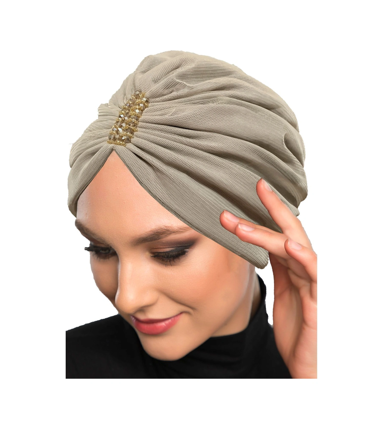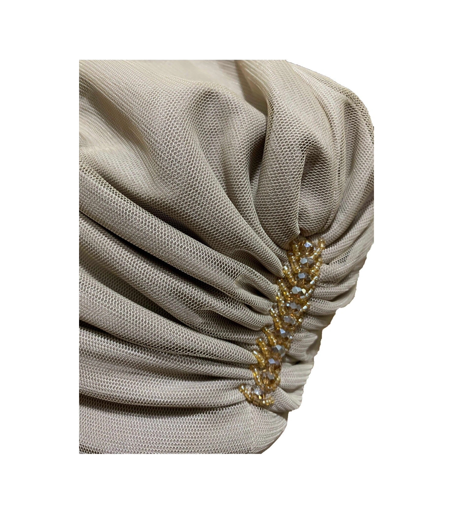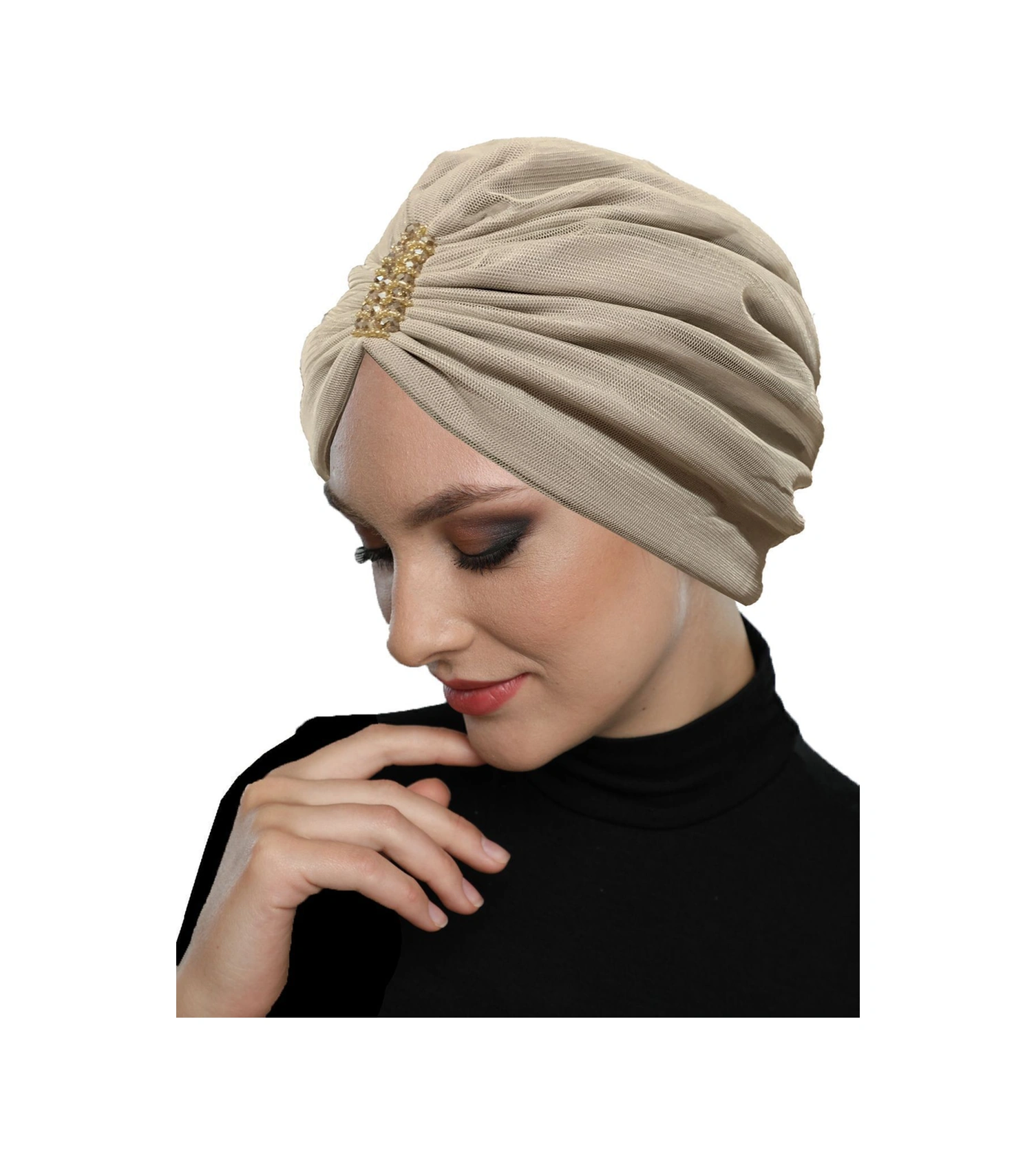 Dizayn Tüllü Kristal Taş İşlemeli Çift Taraflı Astarlı Açık Bej Hazır Türban Tesettür Abiye Bone. Açık Bej