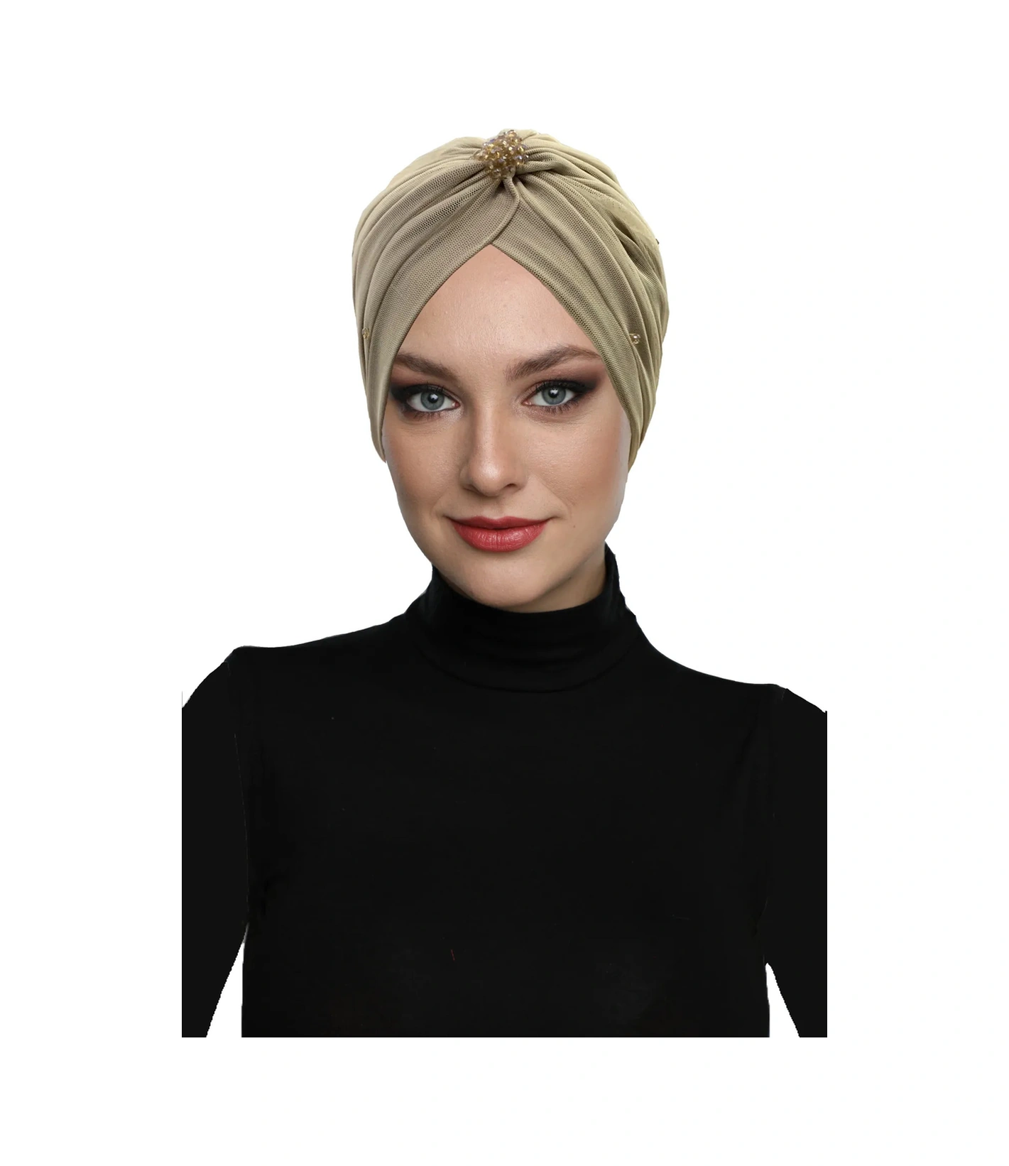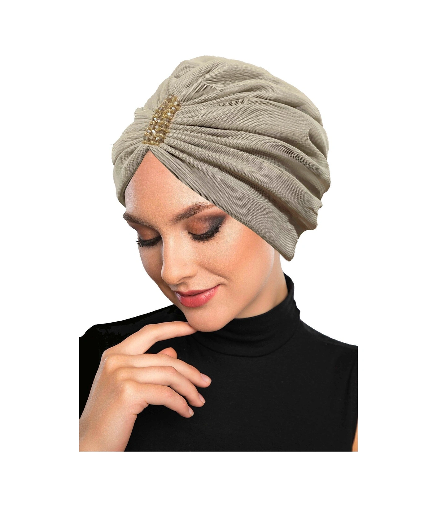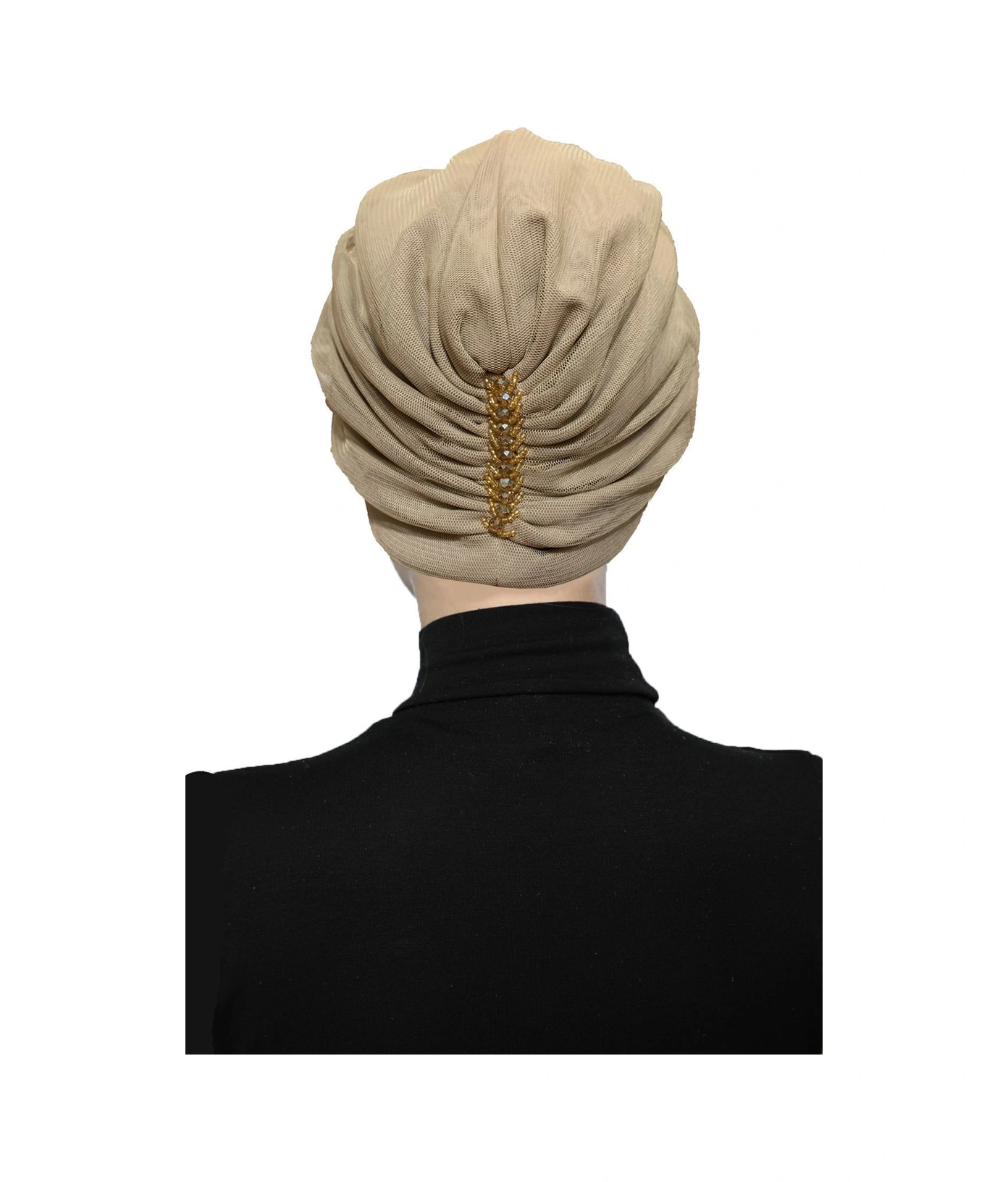 Dizayn Tüllü Kristal Taş İşlemeli Çift Taraflı Astarlı Açık Bej Hazır Türban Tesettür Abiye Bone. Açık Bej