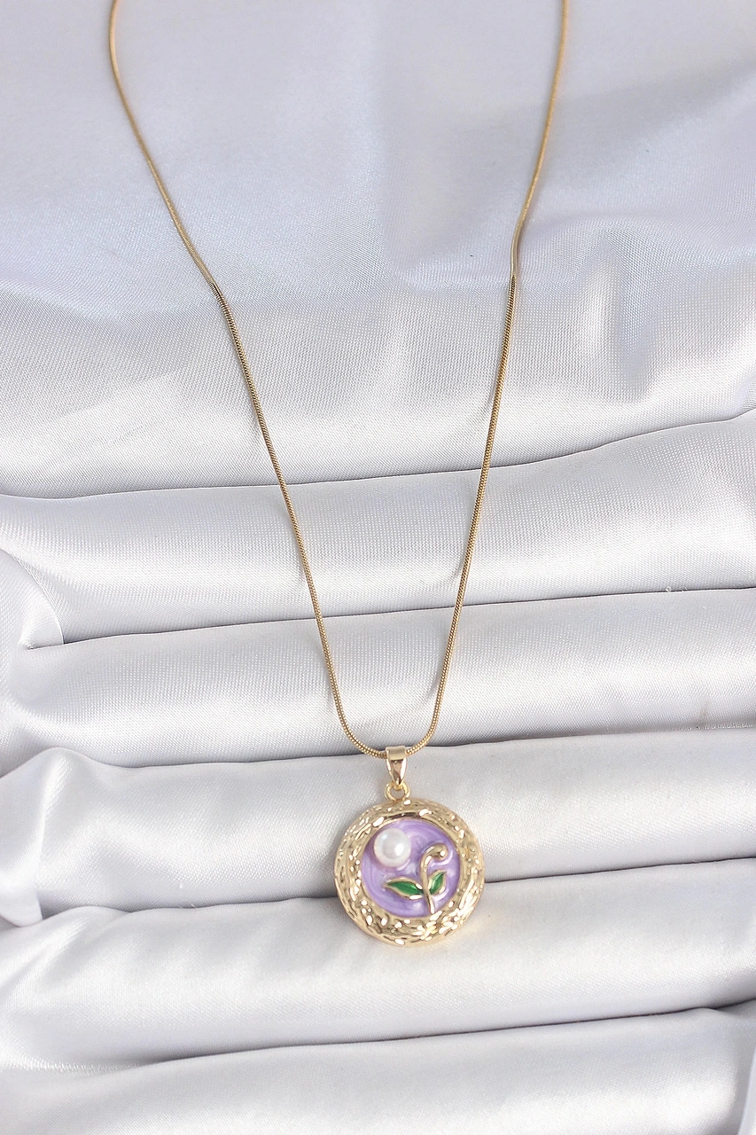 Dodes Dodes 316l Çelik Gold Renk Zincir Mor Çiçek İşlemeli İnci Detay Potre Model Kadın Kolye Tg27bk Çok renkli