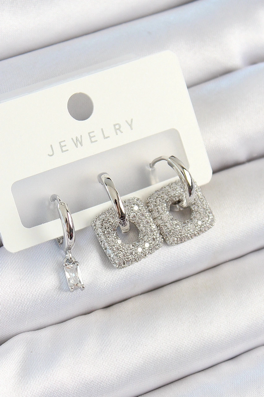 Dodes Dodes Pirinç Zirkon Taşlı Kare Model Gümüş Renk 3'lü Çift Kadın Küpe Set Tg27bkp10806 Çok Renkli