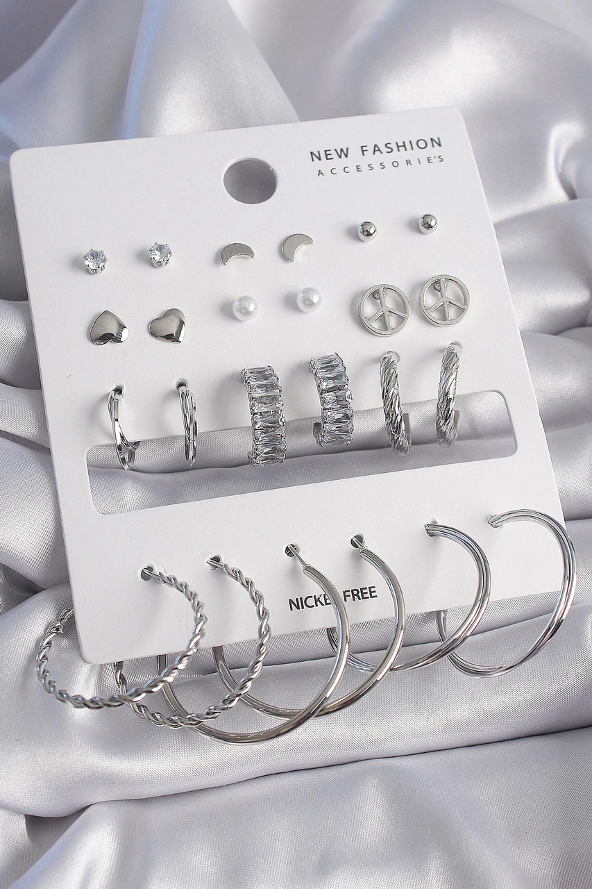 Dodes Pirinç Gümüş Renk Zirkon Taşlı 12 Çift Kadın Küpe Seti Tg27bkp9682 Çok Renkli