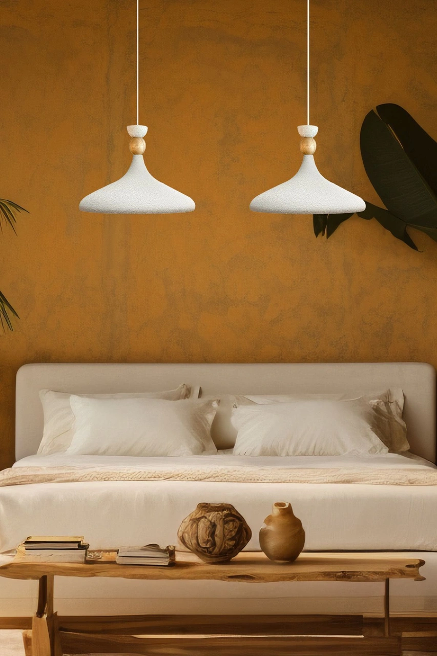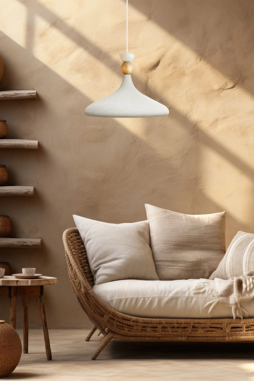 Dokulu Açık Krem Ahşap Şapka Tekli Avize Sarkıt Salon Mutfak Cafe Butik Lamba Aydınlatma Avizeler Dokulu Açık Krem