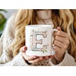 E Harfli Çiçek Desenli Kupa Bardak - Ekose Desenli Yeşil Pembe Desenli Tasarım - Kişiye Özel Hediye Beyaz