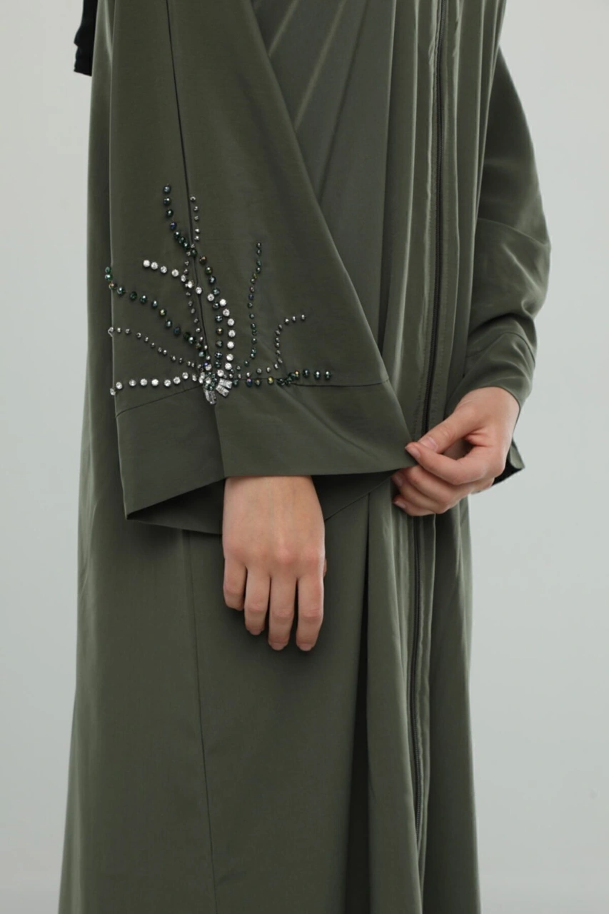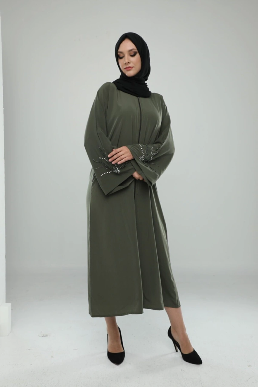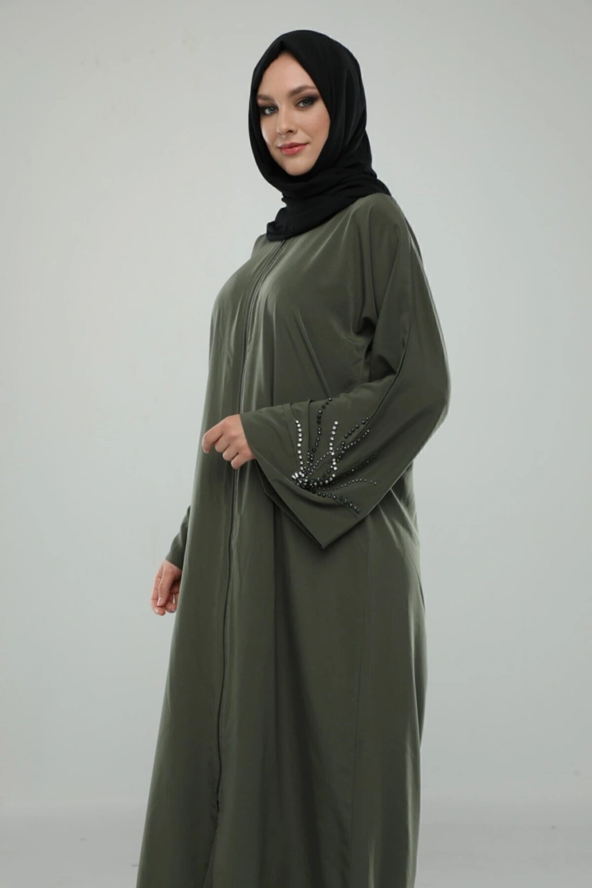 El Işi Taş Işlemeli Fermuarlı Haki Renk Ferace Tesettür Kadın Haki