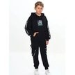 Erkek Çocuk New York Yazılı Çizgi Şeritli Kanguru Cepli Kapüşonlu Siyah Eşofman Takımı Siyah