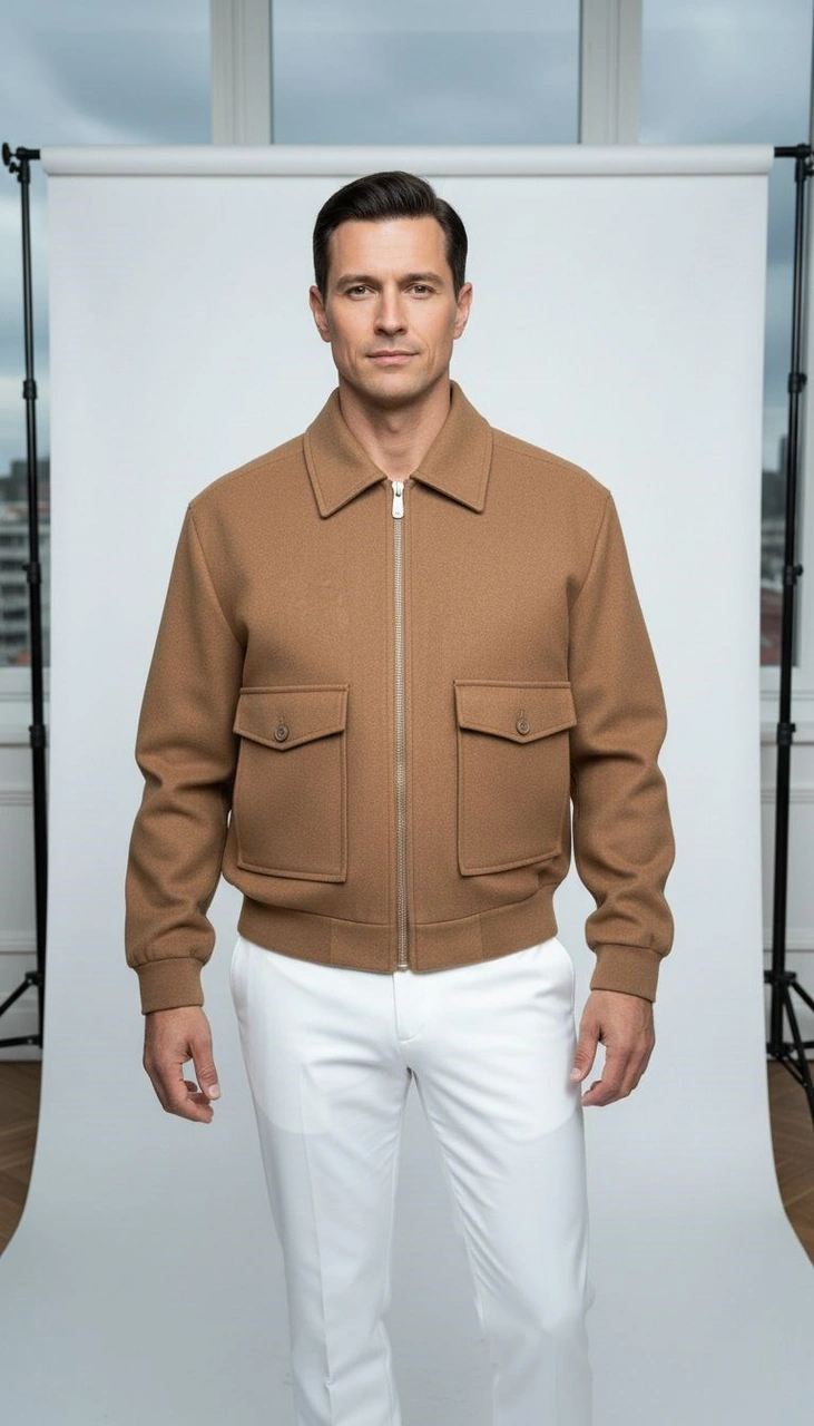 Deepsea Erkek Bej Dar Kesim Likralı Fermuarlı Süet Kumaş Ceket İnce Mont 2504334 False Bej