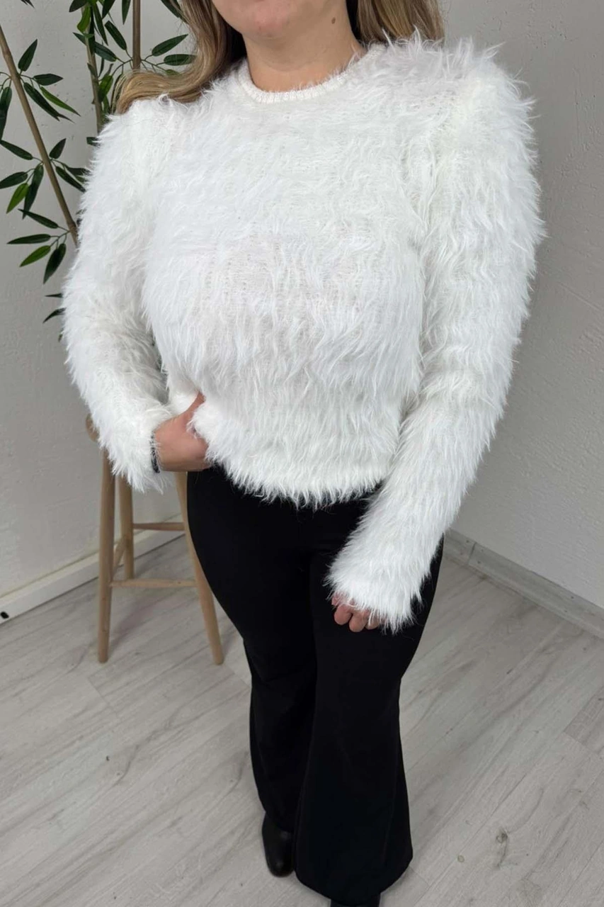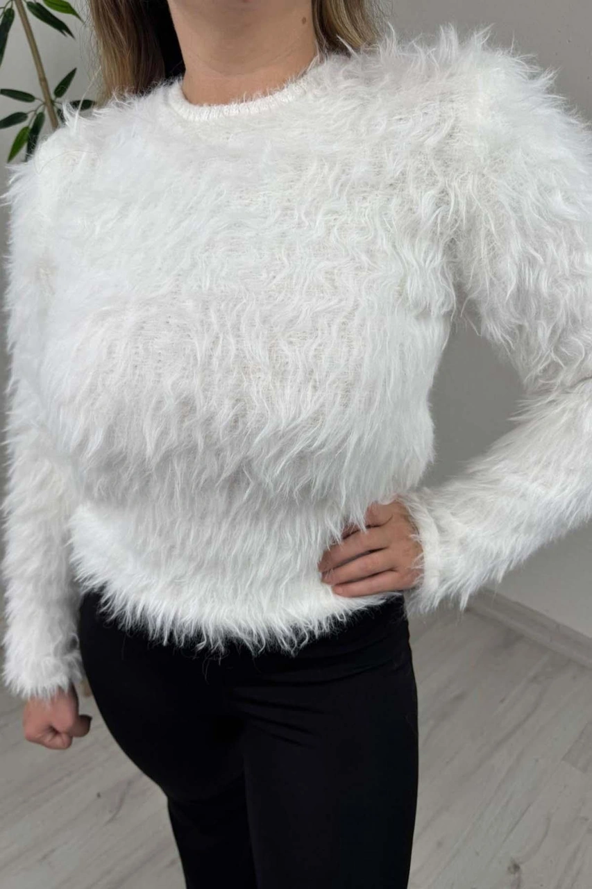 Explode - Kadın Beyaz Bisiklet Yaka Tüylü Yumoş Oversize Triko Kazak Beyaz