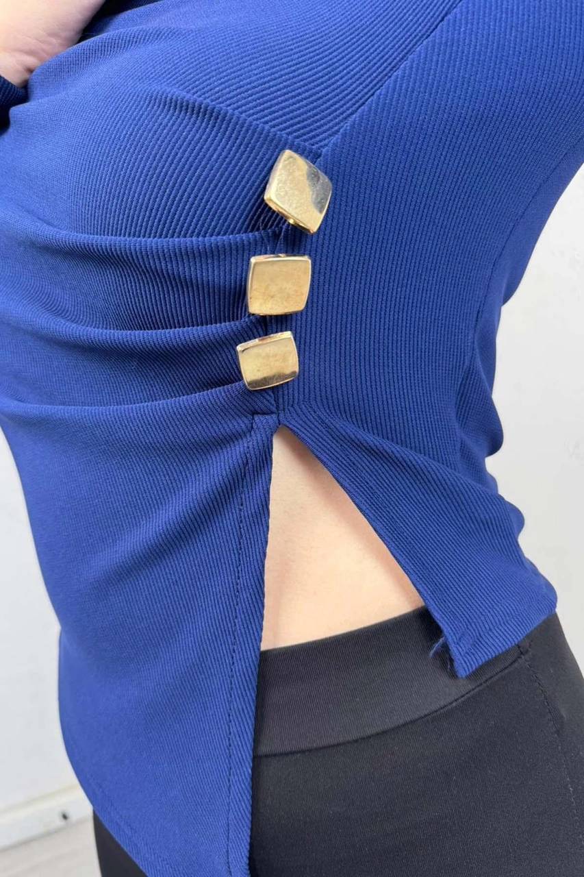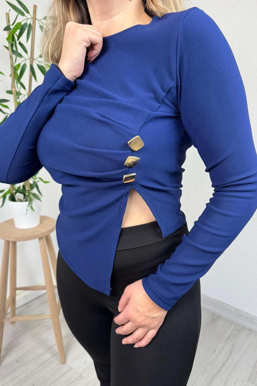 Explode - Kadın Lacivert Bisiklet Yaka Asimetrik Etek Düğmeli Bluz Lacivert