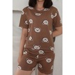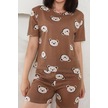 Fames Pijama Yazlık Desenli Loose Crop Şortlu Pijama Takım Kahverengi