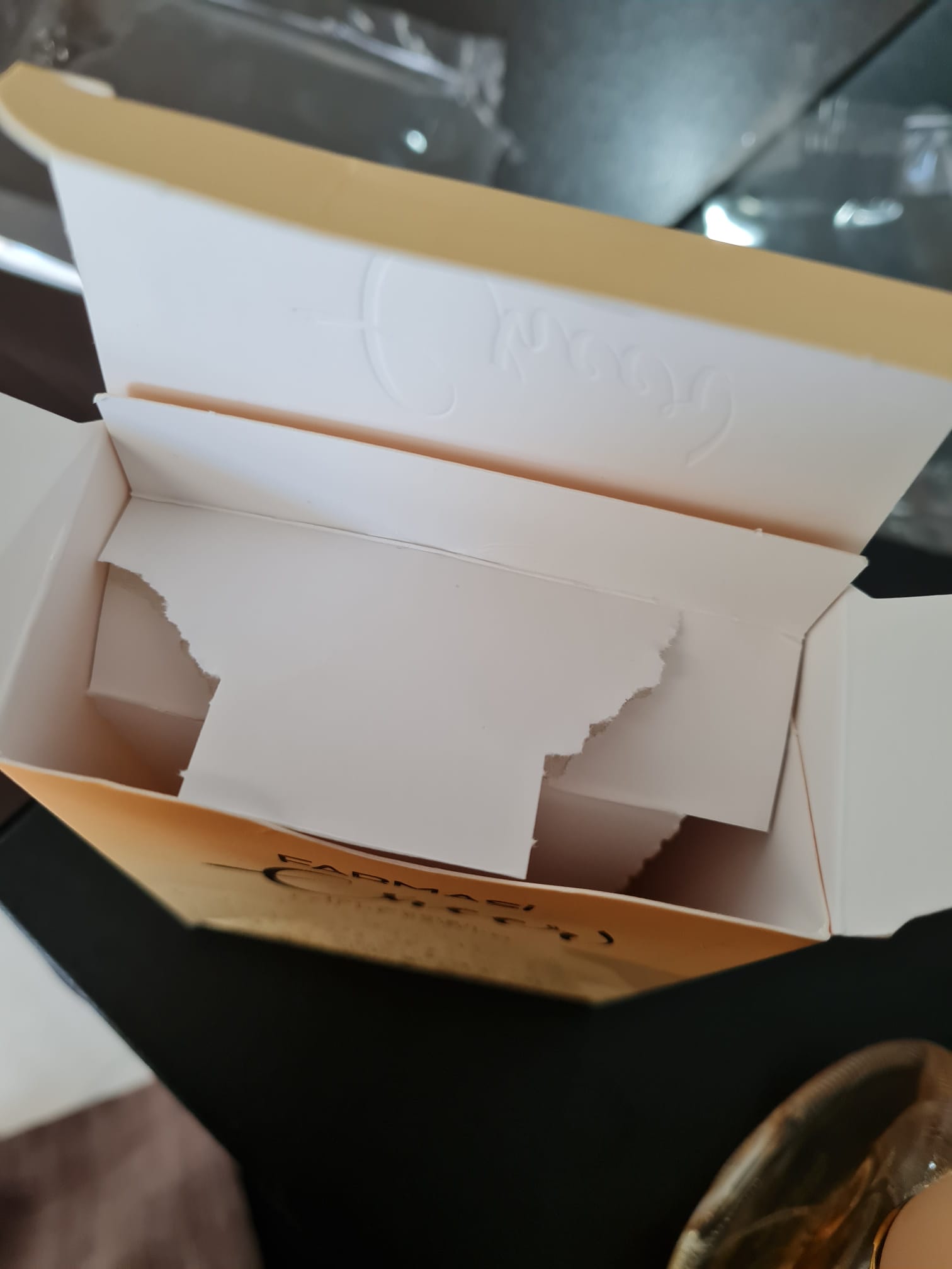 2 tane almıştım. 2sininde paketini açtığımda fotoğraftaki gibi yırttık çıktı kutusu. Bir şişenin de parfüm sıkılan yeri kırıktı, şişe de catlaktı. Bir miktarı akmıştı